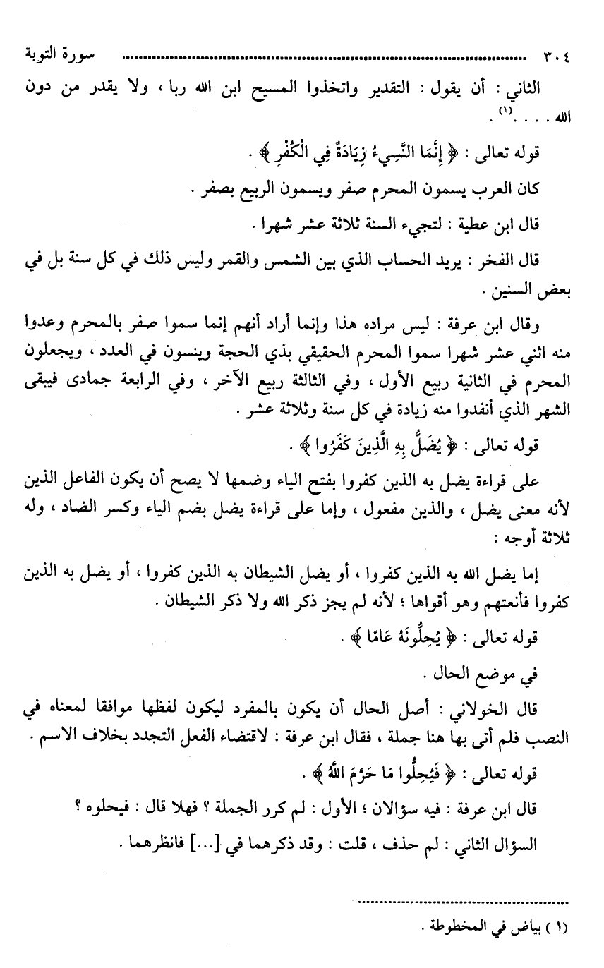 وقال ابن عرفة: ليس مراده هذا وإنما أراد أنهم إنما سموا صفر بالمحرم وعدوا منه اثني عشر شهرا سموا المحرم الحقيقي بذي الحجة وينسون في العدد، ويجعلون المحرم في الثانية ربيع الأول، وفي الثالثة ربيع الآخر، وفي الرابعة جمادي فيبقى الشهر الذي أنفدوا منه زيادة في كل سنة وثلاثة عشر.
