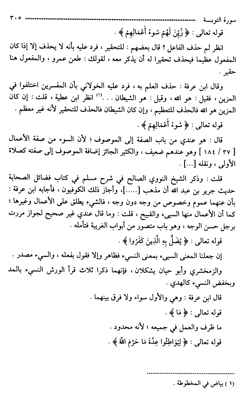 وقال ابن عرفة: حذف العلم به، فرد عليه الخولاني بأن المفسريين اختلفوا في المزين، فقيل: هو الله، وقيل: هو الشيطان [ ... ] انظر ابن عطية، قلت: إن كان المزين هو الله فالحذف للتعظيم، وإن كان الشيطان فالحذف للتحقير لأنه غير معظم.