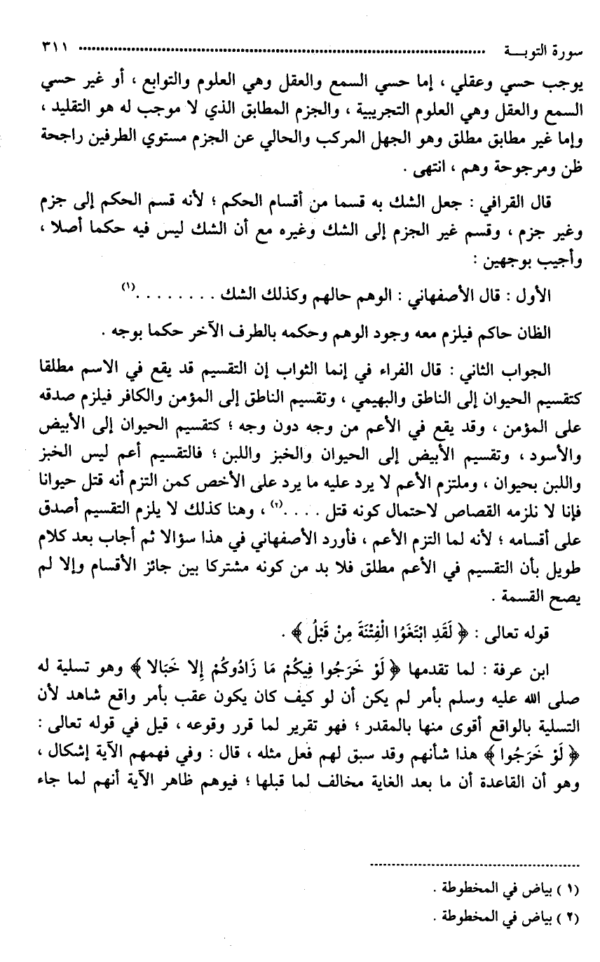 الجواب الثاني: قال الفراء في إنما الثواب إن التقسيم قد يقع في الاسم مطلقا كتقسيم الحيوان إلى الناطق والبهيمي، وتقسيم الناطق إلى المؤمن والكافر فيلزم صدقه على المؤمن، وقد يقع في الأعم من وجه دون وجه؛ كتقسيم الحيوان إلى الأبيض والأسود، وتقسيم الأبيض إلى الحيوان والخبز واللبن؛ فالتقسيم أعم ليس الخبز واللبن بحيوان، وملتزم الأعم لَا يرد عليه ما يرد على الأخص كمن التزم أنه قتل حيوانا فإِنا لَا نلزمه القصاص لاحتمال كونه قتل [ ... ]، وهنا كذلك لَا يلزم التقسيم أصدق على أقسامه؛ لأنه لما التزم الأعم، فأورد الأصفهاني في هذا سؤالا ثم أجاب بعد كلام طويل بأن التقسيم في الأعم مطلق فلا بد من كونه مشتركا بين جائز الأقسام وإلا لم يصح القسمة.