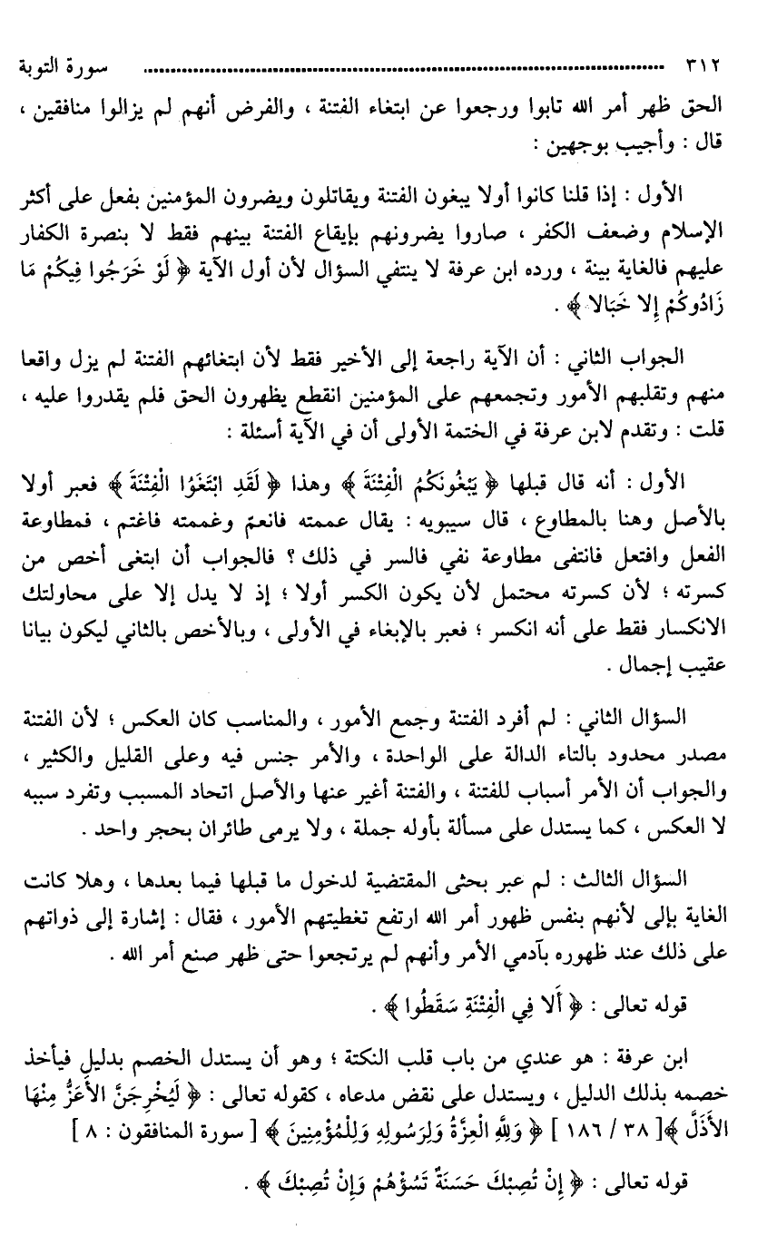 الجواب الثاني: أن الآية راجعة إلى الأخير فقط لأن ابتغائهم الفتنة لم يزل واقعا منهم وتقلبهم الأمور وتجمعهم على المؤمنين انقطع يظهرون الحق فلم يقدروا عليه، قلت: وتقدم لابن عرفة في الختمة الأولى أن في الآية أسئلة: