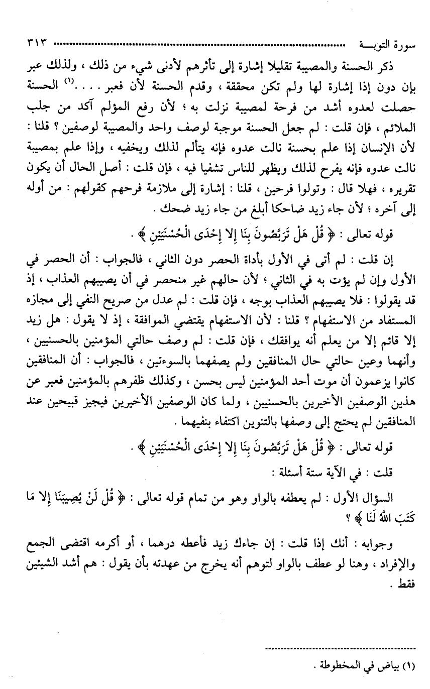 إن قلت: لم أتى في الأول بأداة الحصر دون الثاني، فالجواب: أن الحصر في الأول وإن لم يؤت به في الثاني؛ لأن حالهم غير منحصر في أن يصيبهم العذاب، إذ قد يقولوا: فلا يصيبهم العذاب بوجه، فإن قلت: لم عدل من صريح النفي إلي مجازه المستفاد من الاستفهام؟ قلنا: لأن الاستفهام يقتضي الموافقة، إذ لَا يقول: هل زيد إلا قائم إلا من يعلم أنه يوافقك، فإن قلت: لم وصف حالتي المؤمنين [بالحسنيين، وعين*] حالتي حال المنافقين ولم يصفهما بالسوأتين؟ فالجواب: أن المنافقين كانوا يزعمون أن موت أحد المؤمنين ليس بحسن، وكذلك ظفرهم بالمؤمنين، فعبر عن هذين الوصفين الأخيرين بالحسنيين، ولما كان [نفس*] الوصفين الأخيرين [غير*] قبيحين عند المنافقين لم يحتج إلى وصفها [بالقبيحين*] اكتفاء بنفيهما.