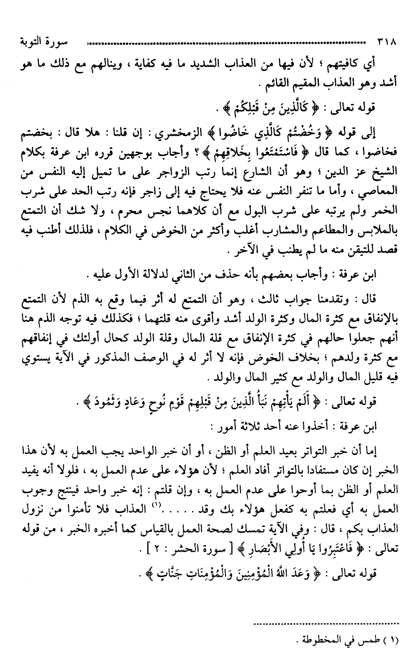 إلى قوله (وَخُضْتُمْ كَالَّذِي خَاضُوا) الزمخشري: إن قلنا: هلا قال: خضتم فخاضوا، كما قال (فَاسْتَمْتَعُوا بِخَلَاقِهِمْ)؟ وأجاب بوجهين قرره ابن عرفة بكلام الشيخ عز الدين؛ وهو أن الشارع إنما رتب الزواجر على ما تميل إليه النفس من المعاصي، وأما ما تنفر النفس عنه فلا يحتاج فيه إلى زاجر فإنه رتب الحد على شرب الخمر ولم يرتبه على شرب البول مع أن كلاهما نجس محرم، ولا شك أن التمتع بالملابس والمطاعم والمشارب أغلب وأكثر من الخوض في الكلام، فلذلك أطنب فيه [قصدًا*] للتيقن منه ما لم يطنب في الآخر.
