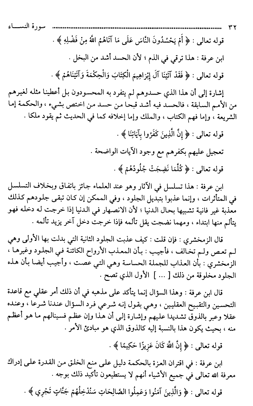 ابن عرفة: هذا تسلسل في الآثار وهو عند العلماء جائز باتفاق وبخلاف التسلسل في المتأثرات، وإنما عذبوا بتبديل الجلود، وفي الممكن إن كان تبقى جلودهم كذلك معذبة غير فانية تشبيها بحال الدنيا؛ لأن الانصهار في الدنيا إذا خرجت له دخله فهو يتألم منها ابتداء، ومهما نضجت يقل تألمه فإذا خرجت دخل آخر يزيد تألمه.