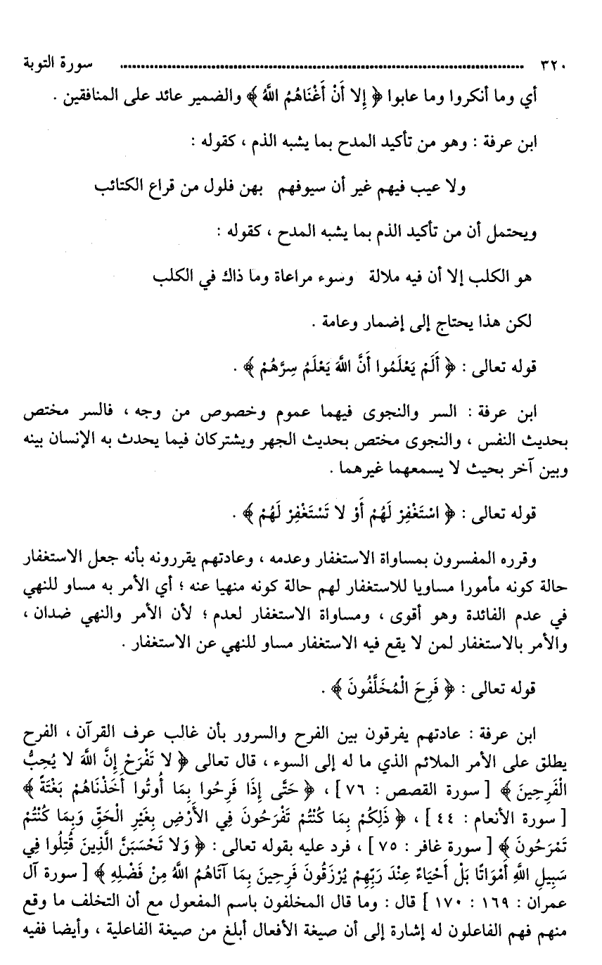 ابن عرفة: عادتهم يفرقون بين الفرح والسرور بأن غالب عرف القرآن، الفرح يطلق على الأمر الملائم الذي ما له [إلا*] السوء، قال تعالى (لَا تَفْرَحْ إِنَّ اللَّهَ لَا يُحِبُّ الْفَرِحِينَ)، (حَتَّى إِذَا فَرِحُوا بِمَا أُوتُوا أخَذنَاهُم بَغْتَةً)، (ذَلِكُم بمَا كُنْتُمْ تَفْرَحُونَ فِي الأَرْضِ بِغَيرِ الْحَقِّ وَبمَا كُنْتُمْ تَمْرَحُونَ)، فَرد عليه بقوله تعالى: (وَلَا تَحْسَبَنَّ الَّذِينَ قُتِلُوا فِي سَبِيلِ اللَّهِ أَمْوَاتًا بَلْ أَحْيَاءٌ عِنْدَ رَبِّهِمْ يُرْزَقُونَ (169) فَرِحِينَ بِمَا آتَاهُمُ اللَّهُ مِنْ فَضْلِ) قال: وما قال المخلفون باسم المفعول مع أن التخلف ما وقع منهم فهم الفاعلون له إشارة إلى أن صيغة الأفعال أبلغ من صيغة الفاعلية، وأيضا ففيه