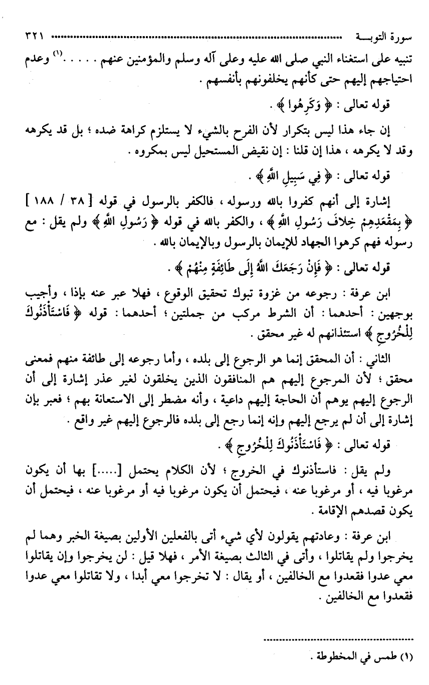 ولم يقل: فاستأذنوك في الخروج؛ لأن الكلام يحتمل [ ... ] بها أن يكون مرغوبا فيه، أو مرغوبا عنه، فيحتمل أن يكون مرغوبا فيه أو مرغوبا عنه، فيحتمل أن يكون قصدهم الإقامة.