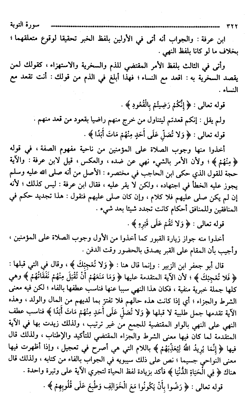 أخذوا منها وجوب الصلاة على المؤمنين من ناحية مفهوم الصفة، في قوله (مِنْهُم)؛ ولأن الأمر بالشيء نهي عن ضده، والعكس، قيل لابن عرفة: والآية حجة للقول الذي حكى ابن الحاجب في مختصره: الأصل من أنه صلى الله عليه وسلم يجوز عليه الخطأ في اجتهاده، ولكن لَا يقر عليه، فقال ابن عرفة: ليس كذلك؛ لأنه إن لم يكن صلى عليهم فلا كلام، وإن كان صلى عليهم فنقول: هذا تجديد حكم في المنافقين وللمنافق أحكام كانت تجدد شيئا بعد شيء.