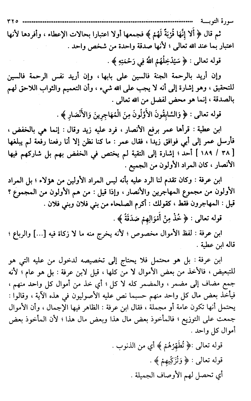 ابن عرفة: بل هو محتمل فلا يحتاج إلى تخصيصه لدخول (مِن) عليه التي هو للتبعيض، فالأخذ من بعض الأموال لَا من كلها، قيل لابن عرفة: بل هو عام؛ لأنه جمع مضاف إلى مضمر، والمضمر كله لَا كل؛ أي خذ من أموال كل واحد منهم، فيأخذ بعض مال كل واحد منهم حسبما نص عليه الأصوليون في هذه الآية، وقالوا: يحتمل أنها تكون عامة أو مجملة، فقال ابن عرفة: الظاهر فيها الإجمال، وأن الأموال جمعت على التوزيع؛ فالمأخوذ بعض مال هذا وبعض مال هذا؛ لأن المأخوذ بعض أموال كل واحد.
