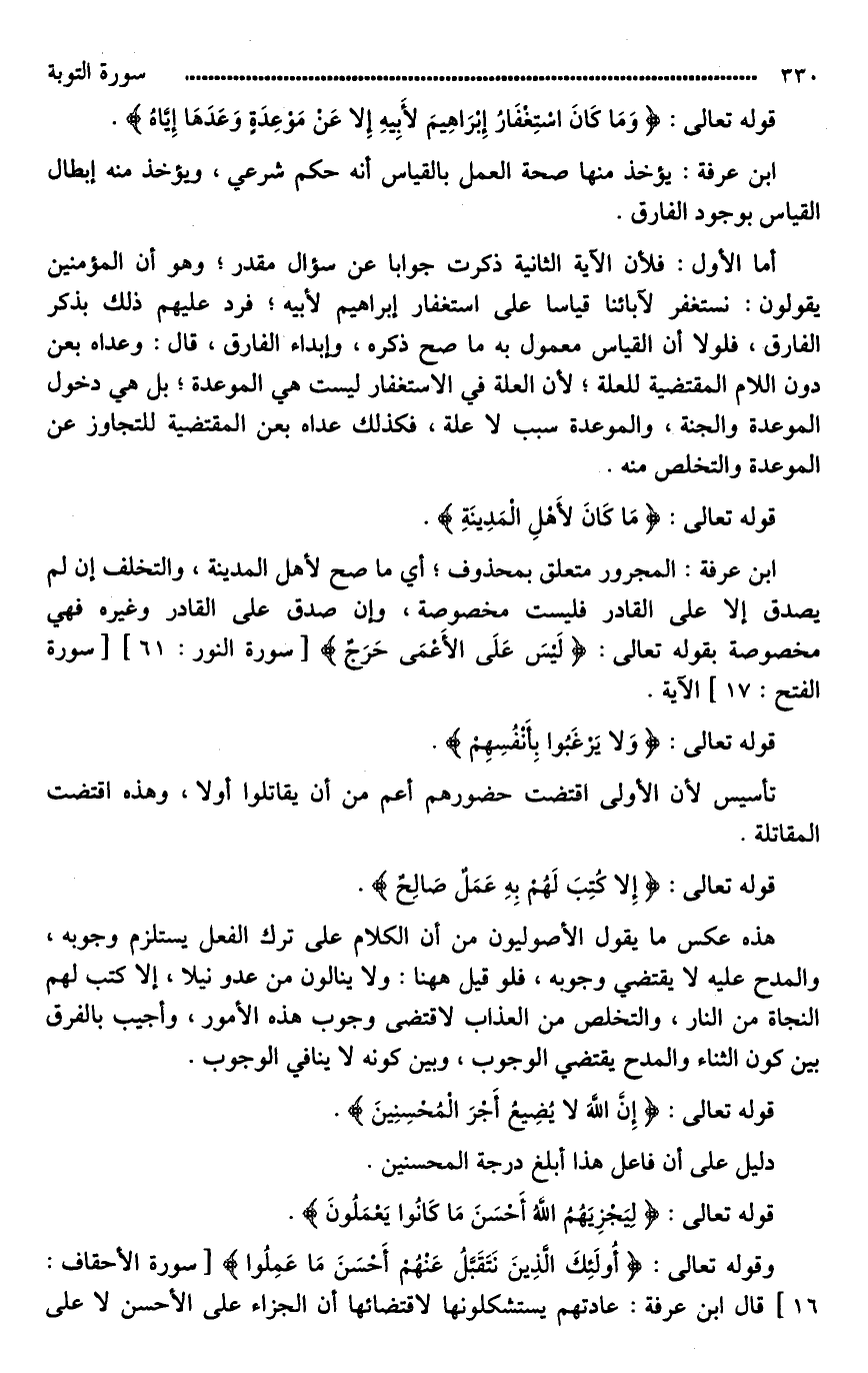 أما الأول: فلأن الآية الثانية ذكرت جوابا عن سؤال مقدر؛ وهو أن المؤمنين يقولون: نستغفر لآبائنا قياسا على استغفار إبراهيم لأبيه؛ فرد عليهم ذلك بذكر الفارق، فلولا أن القياس معمول به ما صح ذكره، وإبداء الفارق، قال: وعداه بعن دون اللام المقتضية للعلة؛ لأن العلة في الاستغفار ليست هي الموعدة؛ بل هي دخول الموعدة والجنة، والموعدة سبب لَا علة، فكذلك عداه بعن المقتضية للتجاوز عن الموعدة والتخلص منه.