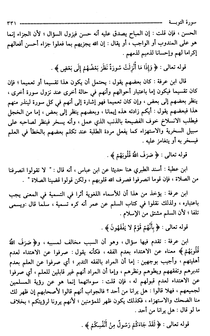 ابن عرفة: تقدم فيها سؤال، وهو أن السبب مخالف لمسببه، و (صَرَفَ اللَّهُ قُلُوبَهُمْ) معناه عن الاهتداء بعدم الفقه، فكأنه يقول: صرفوا عن الاهتداء لعدم أهليتهم، وأجيب بوجهين: إما أن المراد بالفقه التدبر. أي صرفوا عن العلم بعدم تدبرهم وتفقههم [وبسوء*] نظرهم، وإما أن المراد أنهم غير قابلين للعلم، أي صرفوا عن الاهتداء لعدم قبولهم له، فإن قلت: سوءاتهما إنما هو عن رؤية المسلمين لجميعهم، فهلا قالوا: هل يرانا من أحد؟ فالجواب أنهم قالوا لأصحابهم إن ظهر لك منا الضحك والاستهزاء، فكذلك يكون ظهر للمؤمنين؛ لأنهم يرونا لرؤيتكم؛ بخلاف ما لو قال: هل يرانا من أحد.