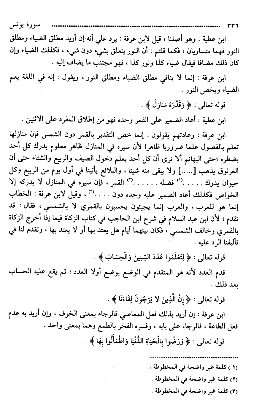 ابن عرفة: وعادتهم يقولون: إنما خص التقدير بالقمر دون الشمس فإن منازلها تعلم بالفصول علما ضروريا ظاهرا؛ لأن سيره في المنازل ظاهر معلوم [يدرك كل أحد ببصره*]؛ حتى البهائم ألا ترى أن كل أحد يعلم دخول الصيف والربيع والشتاء حتى أن الغرنوق يذهب [ ... ] ولا يبقى منه شيئا، والبلائع يأتينا في أول يوم من الربيع وكل حيوان يدرك [ ... ]. فضله [ ... ] القمر، فإن سيره في المنازل لَا يدركه إلا الخواص فكذلك أعاد الضمير عليه وحده دون [ ... ]، وقيل لابن عرفة: الخطاب إنما هو للعرب، والعرب إنما [يحسبون*] بالقمري لَا بالشمسي، فقال: قد تقدم؛ لأن ابن عبد السلام في شرح ابن الحاجب في كتاب الزكاة فيما إذا أخرج الزكاة بالقمري وخالف الشمسي، فكان بينهما أيام هل يعتد بها أو لَا يعتد بها، وتقدم لنا في تأليفنا الرد عليه.