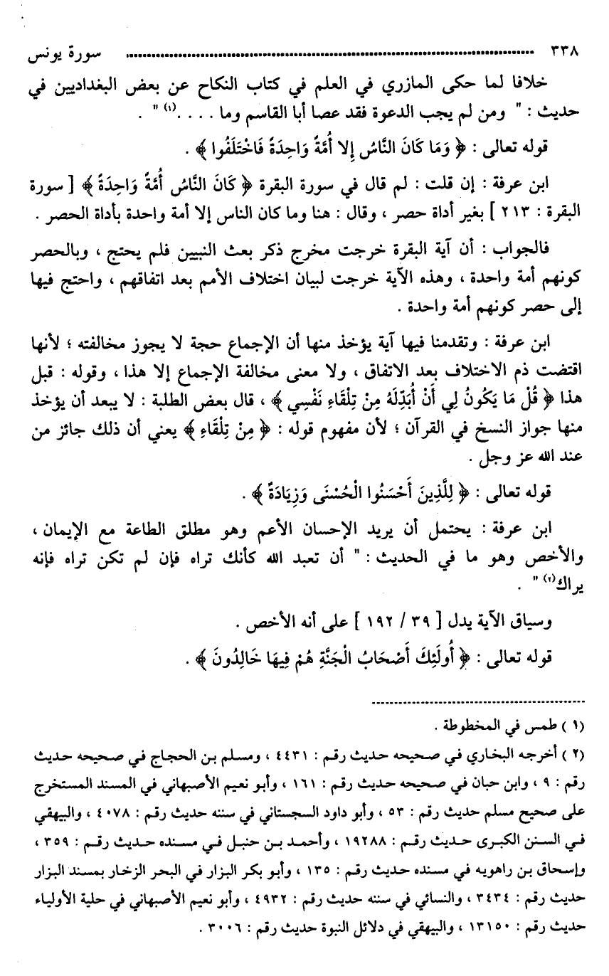 ابن عرفة: إن قلت: لم قال في سورة البقرة (كَانَ النَّاسُ أُمَّةً وَاحِدَةً) بغير أداة حصر، وقال: هنا (وما كان النَّاس إلا أمة واحدة) بأداة الحصر.