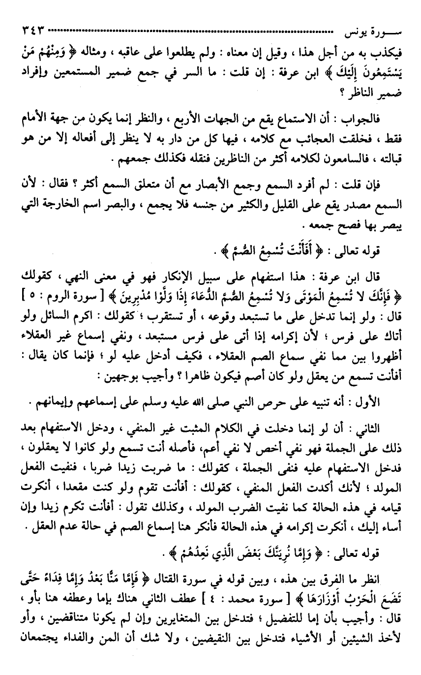 الثاني: أن لو إنما دخلت في الكلام المثبت غير المنفي، ودخل الاستفهام بعد ذلك على الجملة فهو نفي أخص لَا نفي أعم، فأصله أنت تسمع ولو كانوا لَا يعقلون، فدخل الاستفهام عليه فنفى الجملة، كقولك: ما ضربت زيدا ضربا، فنفيت الفعل المولد. لأنك أكدت الفعل المنفي، كقولك: أفأنت تقوم ولو كنت مقعدا، أنكرت قيامه في هذه الحالة كما نفيت الضرب المولد، وكذلك تقول: أفأنت تكرم زيدا وإن أساء إليك، أنكرت إكرامه في هذه الحالة فأنكر هنا إسماع الصم في حالة عدم العقل.