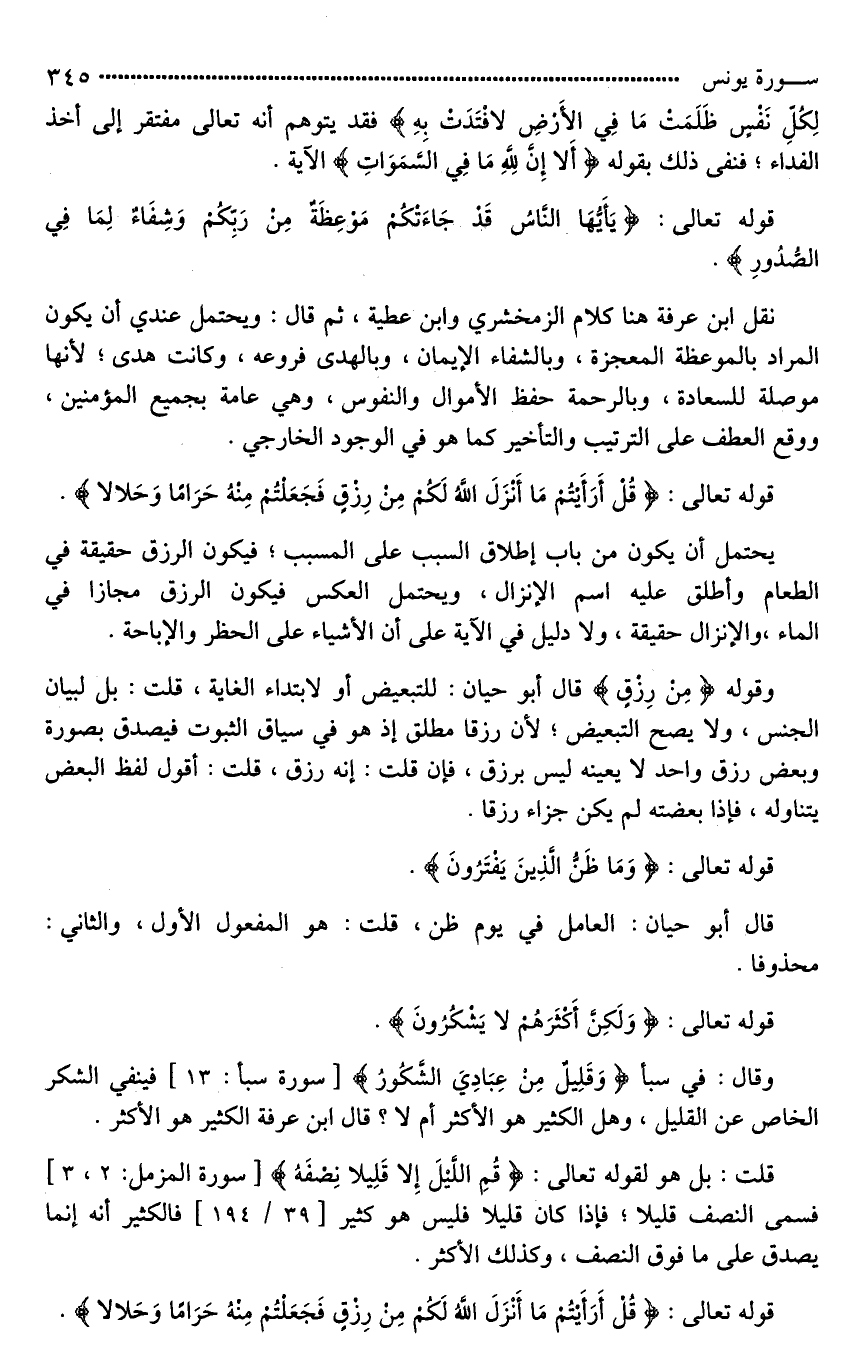 وقال: في سبأ (وَقَلِيل مِنْ عِبَادِيَ الشكُورُ) فينفي الشكر الخاص عن القليل، وهل الكثير هو الأكثر أم لَا؟ قال ابن عرفة الكثير هو الأكثر.