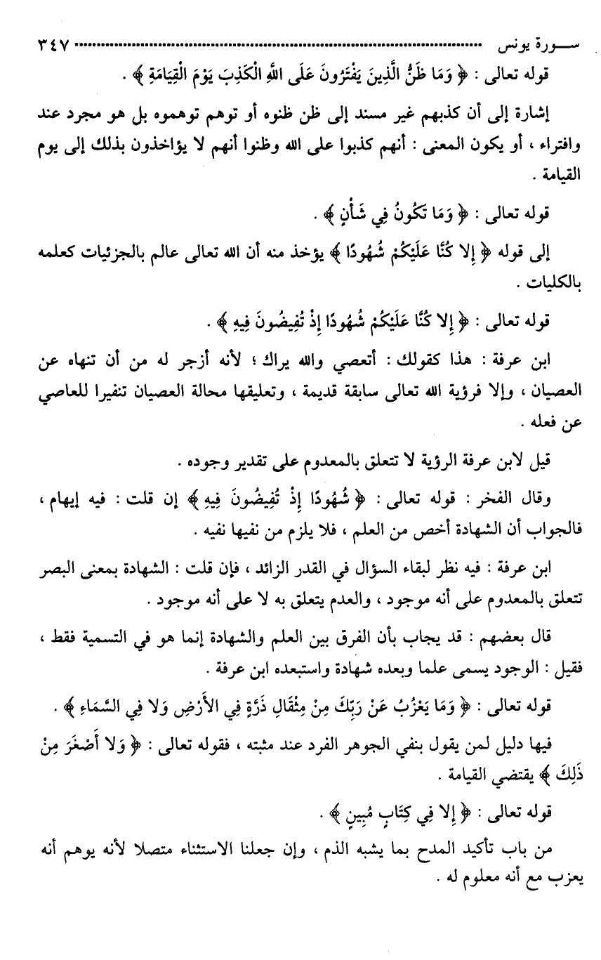 إلى قوله (إِلَّا كُنَّا عَلَيْكُمْ شُهُودًا) يؤخذ منه أن الله تعالى عالم بالجزئيات كعلمه بالكليات.