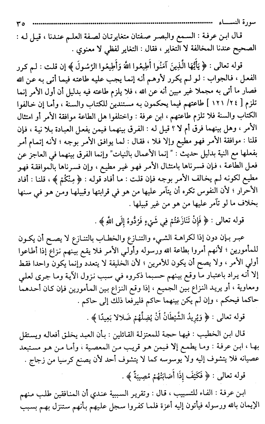 قوله تعالى: {يَا أَيُّهَا الَّذِينَ آمَنُوا أَطِيعُوا اللَّهَ وَأَطِيعُوا الرَّسُولَ ... (59)} .. إن قلت: لم كرر الفعل، فالجواب: لو لم يكرر لأوهم أنه إنما يجب عليه طاعته فيما أتى به عن الله فصار ما أتى به مجملا غير مبين أنه عن الله، فلا يلزم طاعته فيه بدليل أن أول الأمر إنما تلزم طاعتهم فيما يحكمون به مستندين للكتاب والسنة، وأما إن خالفوا الكتاب والسنة فلا تلزم طاعتهم، ابن عرفة: واختلفوا هل الطاعة موافقة الأمر أو امتثال الأمر، وهل بينهما فرق أم لَا؟ قيل له: الفرق بينهما فيمن يفعل العبادة بلا نية، فإن قلنا: موافقة الأمر فهو مطيع وإلا فلا، فقال: لما يوافق الأمر بوجه؛ لأنه إتمام أمر بفعلها مع النية بدليل حديث: "إنما الأعمال بالنيات" وإنما الفرق بينهما في العاجز عن فعل الطاعة، فإن فسرناها بامتثال الأمر فهو غير مطيع، وإن فسرناها بالموافقة فهو مطيع لكونه لم يخالف الأمر بوجه فإن قلت: ما أفاد قوله: (مِنْكُمْ)، قلنا: أفاد الأحرار؛ لأن النفوس تكره أن يتآمر عليها من هو في قرابتها وقبيلها ومن هو في سنها بخلاف ما لو تآمر عليها من هو من غير قبيلها.