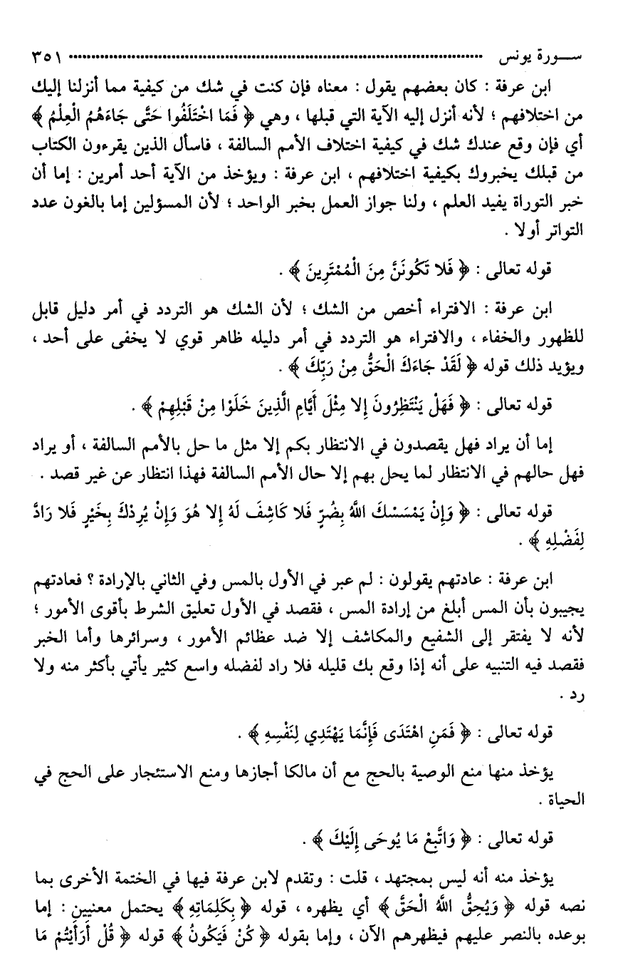 ابن عرفة: كان بعضهم يقول: معناه فإن كنت في شك من كيفية مما أنزلنا إليك من اختلافهم؛ لأنه أنزل إليه الآية التي قبلها، وهي (فَمَا اخْتَلَفُوا حَتَّى جَاءَهُمُ الْعِلْمُ) أي فإن وقع عندك شك في كيفية اختلاف الأمم السالفة، (فَاسْأَلِ الَّذِينَ يَقْرَءُونَ الْكِتَابَ مِنْ قَبْلِكَ) يخبروك بكيفية اختلافهم، ابن عرفة: ويؤخذ من الآية أحد أمرين: إما أن خبر التوراة يفيد العلم، ولنا جواز العمل بخبر الواحد؛ لأن المسؤلين إما بالغون عدد التواتر أو لا.