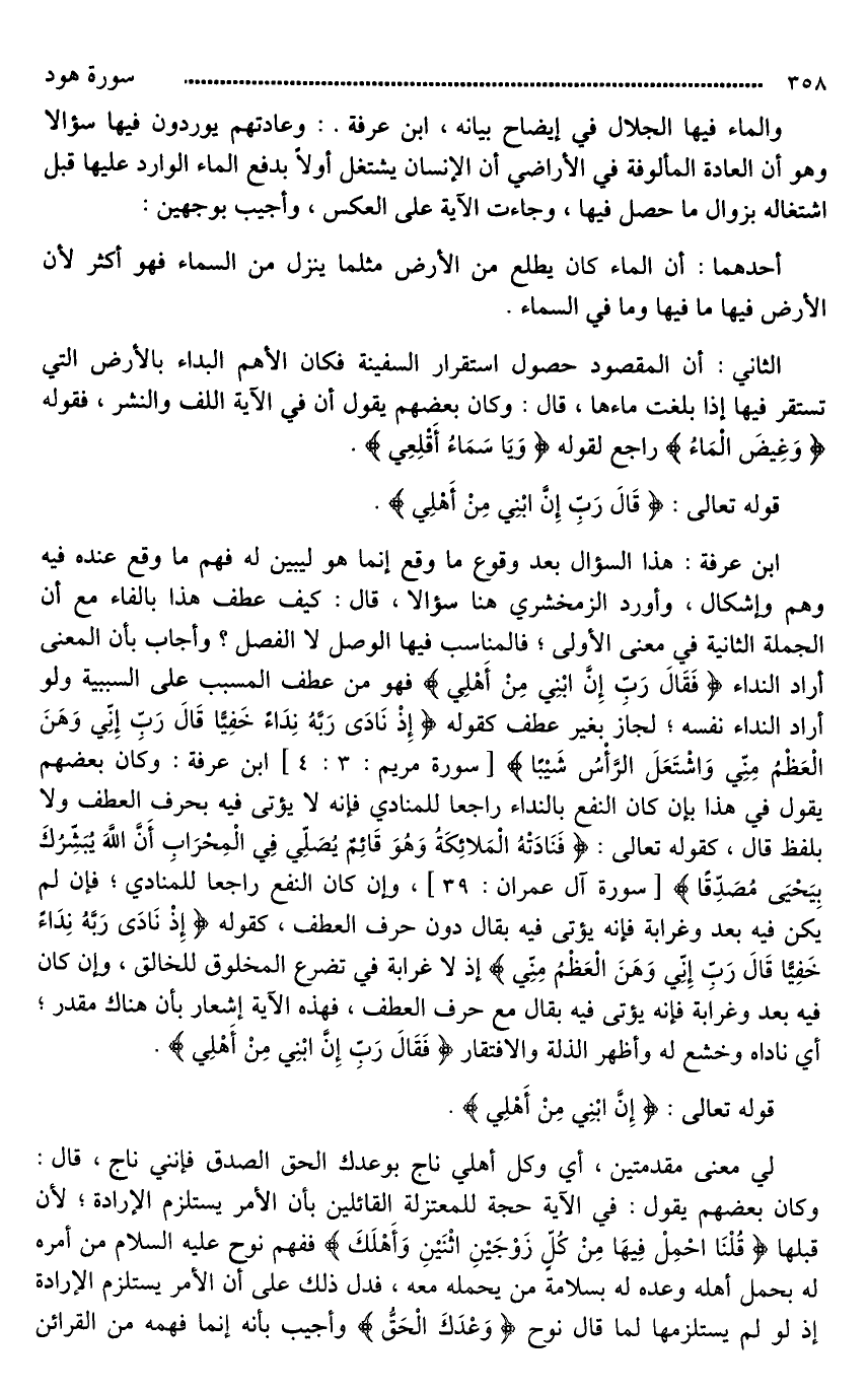 ابن عرفة: هذا السؤال بعد وقوع ما وقع إنما هو ليبين له فهم ما وقع عنده فيه وهمٌ وإشكال، وأورد الزمخشري هنا سؤالا، قال: كيف عطف هذا بالفاء مع أن الجملة الثانية في معنى الأولى؛ فالمناسب فيها الوصل لَا الفصل؟ وأجاب بأن المعنى أراد النداء (فَقَالَ رَبِّ إِنَّ ابْنِي مِنْ أَهْلِي) فهو من عطف المسبب على السببية ولو أراد النداء نفسه؛ لجاز بغير عطف كقوله (إِذْ نَادَى رَبَّهُ نِدَاءً خَفِيًّا (3) قَالَ رَبِّ إِنِّي وَهَنَ الْعَظْمُ مِنِّي وَاشْتَعَلَ الرَّأْسُ شَيْبًا) ابن عرفة: وكان بعضهم يقول في هذا بإن كان النفع بالنداء راجعا للمنادي فإِنه لَا يؤتى فيه بحرف العطف ولا بلفظ قال، كقوله تعالى: (فَنَادَتْهُ الْمَلَائِكَةُ وَهُوَ قَائِمٌ يُصَلِّي فِي الْمِحْرَابِ أَنَّ اللَّهَ يُبَشِّرُكَ بِيَحْيَى مُصَدِّقًا)، وإن كان النفع راجعا للمنادي؛ فإن لم يَكن فيه بعد وغرابة فإنه يؤتى فيه بقال دون حرف العطف، كقوله (إِذْ نَادَى رَبَّهُ نِدَاءً خَفِيًّا (3) قَالَ رَبِّ إِنِّي وَهَنَ الْعَظْمُ مِنِّي) إذ لَا غرابة في تضرع المخلوق للخالق، وإن كان فيه بعد وغرابة فإنه يؤتى فيه بقال مع حرف العطف، فهذه الآية إشعار بأن هناك مقدر؛ أي ناداه وخشع له وأظهر الذلة والافتقار (فَقَالَ رَبِّ إِنَّ ابْنِي مِنْ أَهْلِي).
