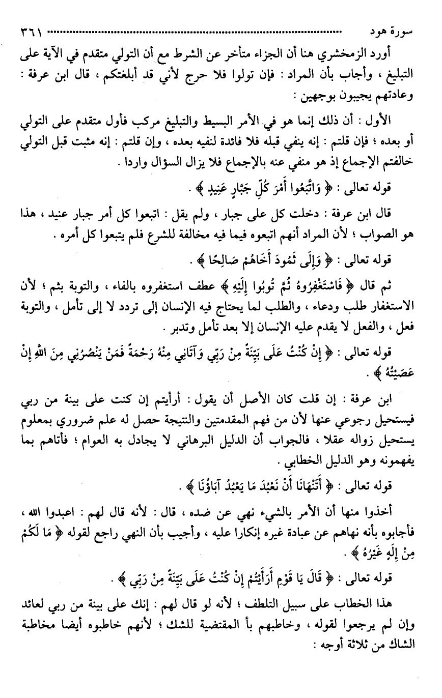 ابن عرفة: إن قلت كان الأصل أن يقول: أرأيتم إن كنت على بينة من ربي فيستحيل رجوعي عنها لأن من فهم المقدمتين والنتيجة حصل له علم ضروري بمعلوم يستحيل زواله عقلا، فالجواب أن الدليل البرهاني لَا يجادل به العوام؛ فأتاهم بما يفهمونه وهو الدليل الخطابي.