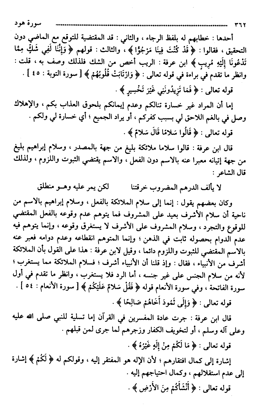 قال ابن عرفة: قالوا [سلام الملائكة بليغ من جهة المصدر*]، وسلام إبراهيم بليغ من جهة إتيانه معبرا عنه بالاسم دون الفعل، والاسم يقتضي الثبوت واللزوم، ولذلك قال الشاعر: