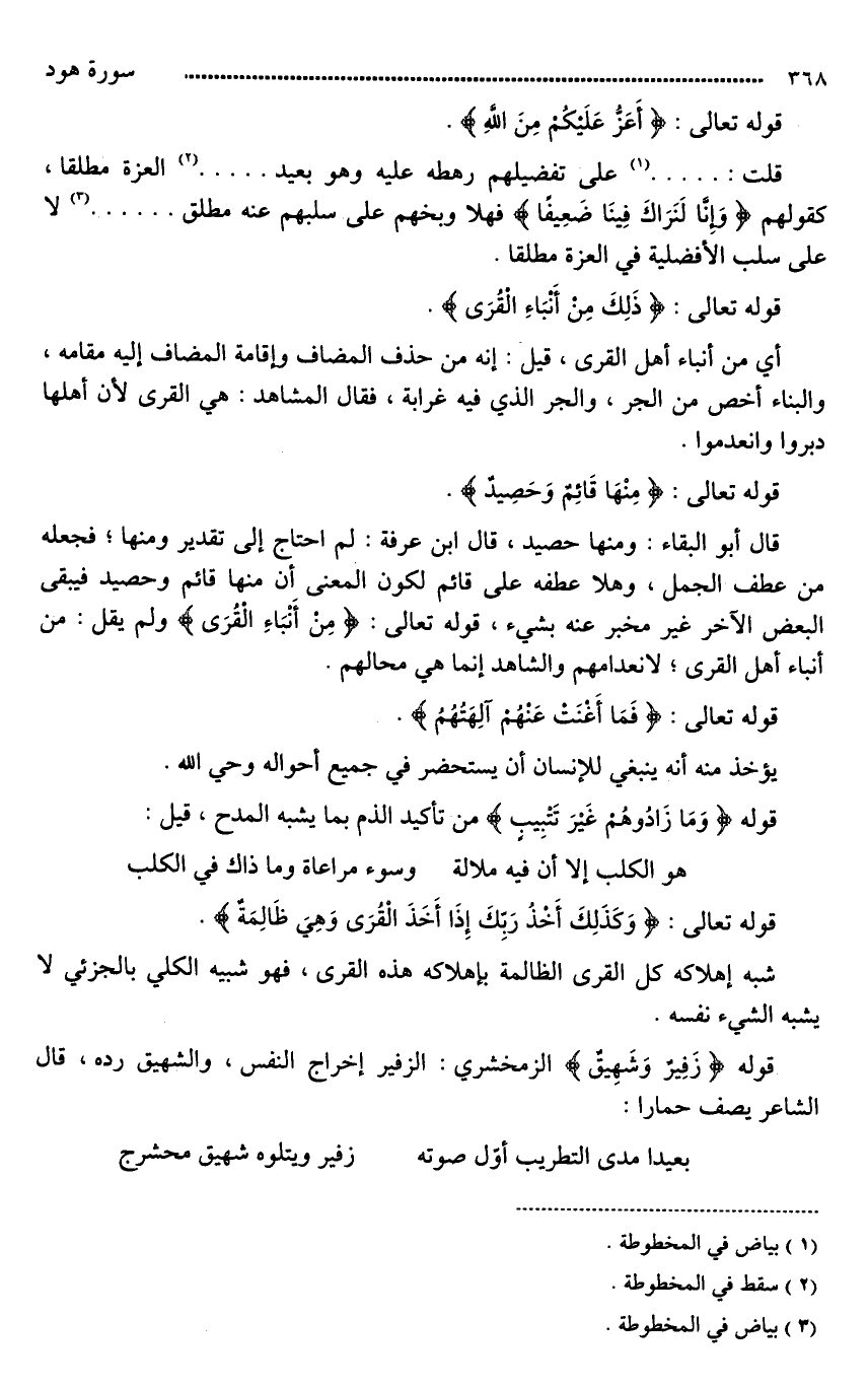 قال أبو البقاء: ومنها حصيد، قال ابن عرفة: لم احتاج إلى تقدير ومنها؛ فجعله من عطف الجمل، وهلا عطفه على قائم لكون المعنى أن منها قائم وحصيد فيبقى البعض الآخر غير مخبر عنه بشيء، قوله تعالى: (مِنْ أَنْبَاءِ الْقُرَى) ولم يقل: من أنباء أهل القرى؛ لانعدامهم والشاهد إنما هي محالهم.