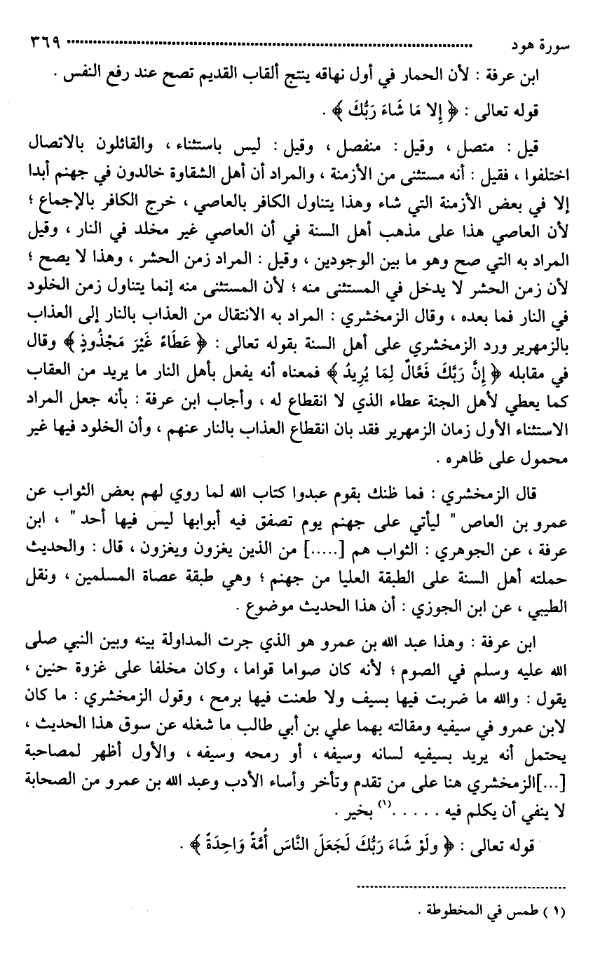 ابن عرفة: وهذا عبد الله بن عمرو هو الذي جرت المداولة بينه وبين النبي صلى الله عليه وسلم في الصوم؛ لأنه كان صواما قواما، وكان مخلفا على غزوة حنين، يقول: والله ما ضربت فيها بسيف ولا طعنت فيها برمح، وقول [الزمخشري: ما كان لابن عمرو في سيفيه ومقالته بهما علي بن أبي طالب ما شغله عن سوق هذا الحديث]، يحتمل أنه يريد بسيفيه لسانه وسيفه، أو رمحه وسيفه، والأول أظهر لمصاحبة [ ... ] الزمخشري هنا على من تقدم وتأخر وأساء الأدب وعبد الله بن عمرو من الصحابة لا ينفي أن يكلم فيه [ ... ] بخير.