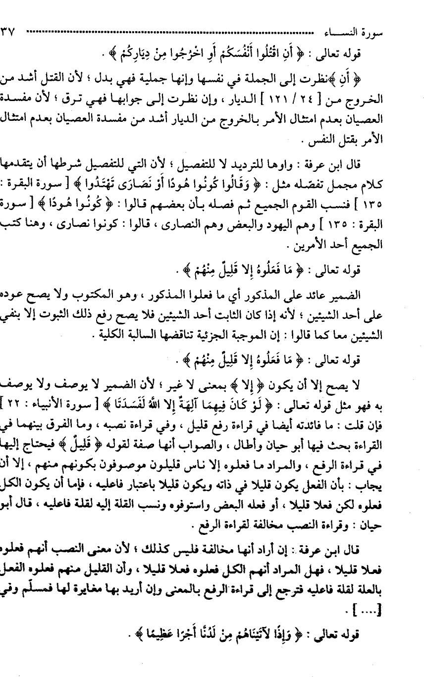 قال ابن عرفة: إن أراد أنها مخالفة فليس كذلك؛ لأن معنى النصب أنهم فعلوه فعلا قليلا، فهل المراد أنهم الكل فعلوه فعلا قليلا، وأن القليل منهم فعلوه الفعل بالعلة لقلة فاعليه فترجع إلى قراءة الرفع بالمعنى، وإن أريد بها مغايرة لها فمسلم وفي [ ... ]