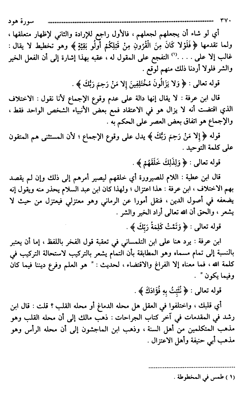 قال ابن عطية: اللام للصيرورة، أي خلقهم ليصير أمرهم إلى ذلك وإن لم يقصد بهم الاختلاف، ابن عرفة: هذا اعتزال؛ ولهذا كان ابن عبد السلام يحذر منه ويقول إنه يضعفه في أصول الدين، فنقل أمورا عن الرماني وهو معتزلي فيعتزل من حيث لا يشعر، والحق أن الله تعالى أراد الخير والشر.