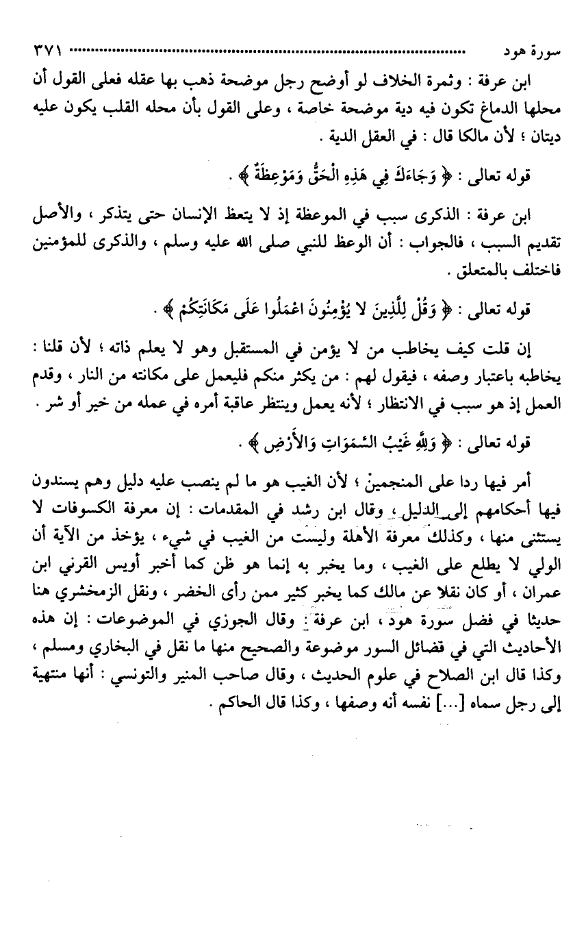 [فيها رد على المنجمين*]؛ لأن الغيب هو ما لم ينصب عليه دليل وهم يسندون فيها أحكامهم إلى الدليل، وقال ابن رشد في المقدمات: إن معرفة الكسوفات لا يستثنى منها، وكذلك معرفة الأهلة وليست من الغيب في شيء، يؤخذ من الآية أن الولي لَا يطلع على الغيب، وما يخبر به إنما هو ظن كما أخبر أويس القرني ابن عمران، أو كان نقلا عن مالك كما يخبر كثير ممن رأى الخضر، ونقل الزمخشري هنا حديثا في فضل سورة هود، ابن عرفة: وقال [ابن الجوزي في الموضوعات*]: إن هذه الأحاديث التي في فضائل السور موضوعة والصحيح منها ما نقل في البخاري ومسلم، وكذا قال ابن الصلاح في علوم الحديث، وقال صاحب المنير والتونسي: إنها منتهية إلى رجل سماه [ ... ]، نفسه أنه وصفها، وكذا قال الحاكم.