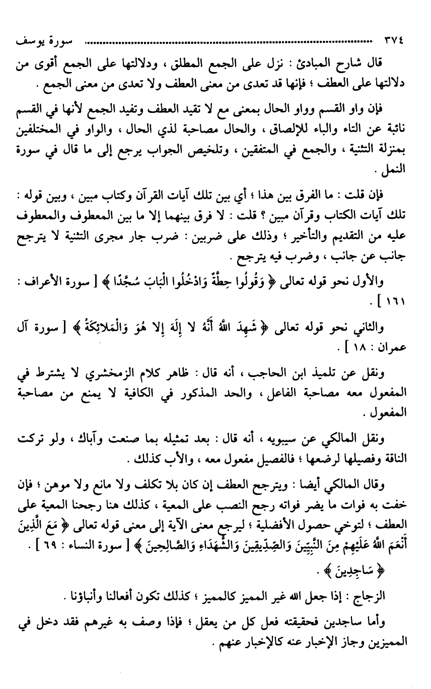 وقال المالكي أيضا: ويترجح العطف إن كان بلا تكلف ولا مانع ولا موهن؛ فإِن خفت به فوات ما يضر فواته رجح النصب على المعية، كذلك هنا رجحنا المعية على العطف؛ لتوخي حصول الأفضلية؛ ليرجع معنى الآية إلى معنى قوله تعالى (مَعَ الَّذِينَ أَنْعَمَ اللَّهُ عَلَيْهِمْ مِنَ النَّبِيِّينَ وَالصِّدِّيقِينَ وَالشُّهَدَاءِ وَالصَّالِحِينَ).