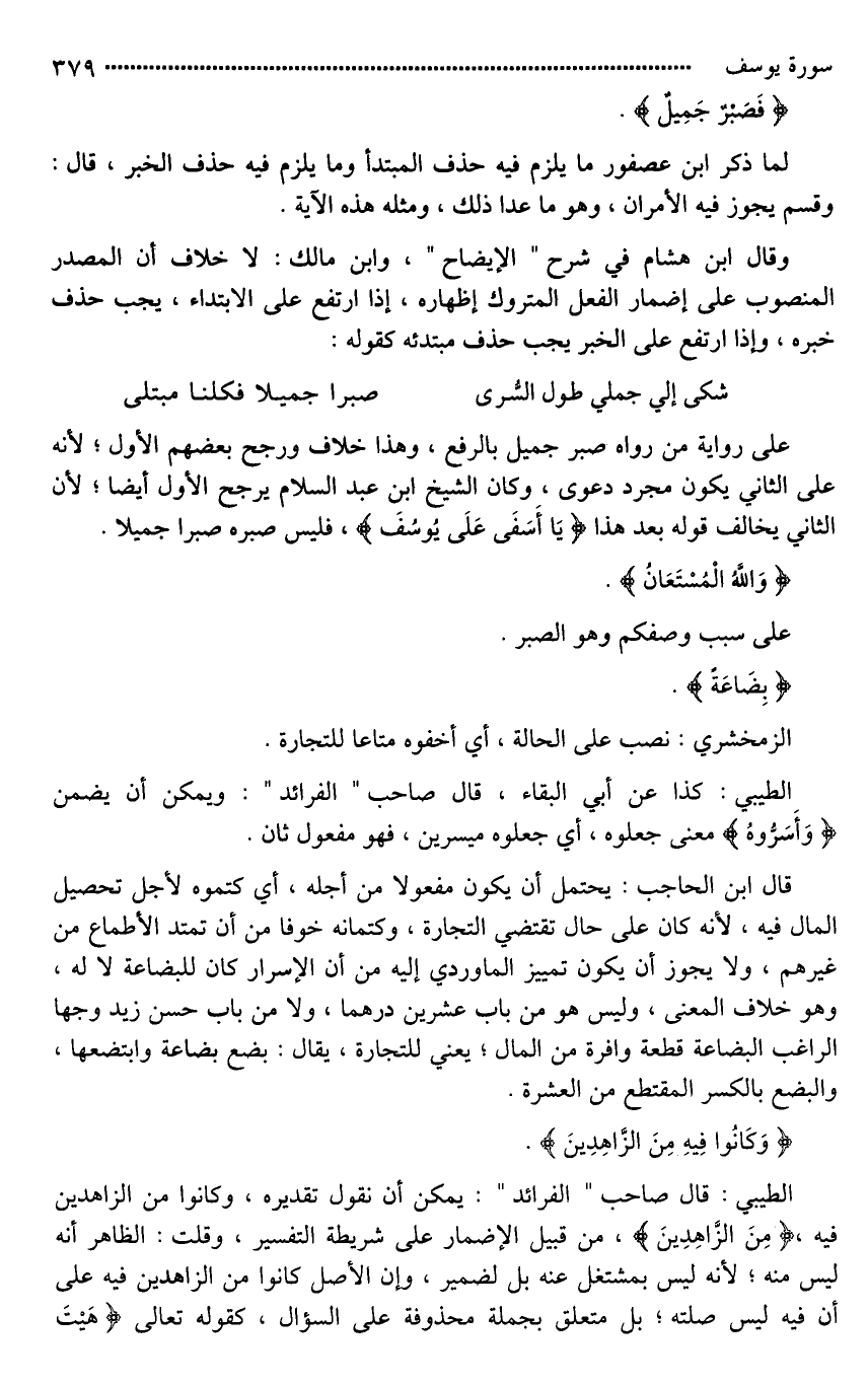 الطيبي: قال صاحب "الفرائد": يمكن أن نقول تقديره، وكانوا من الزاهدين فيه، (مِنَ الزَّاهِدِينَ)، من قبيل الإضمار على شريطة التفسير، وقلت: الظاهر أنه ليس منه؛ لأنه ليس بمشتغل عنه بل لضمير، وإن الأصل كانوا من الزاهدين فيه على أن فيه ليس صلته؛ بل متعلق بجملة محذوفة على السؤال، كقوله تعالى (هَيْتَ