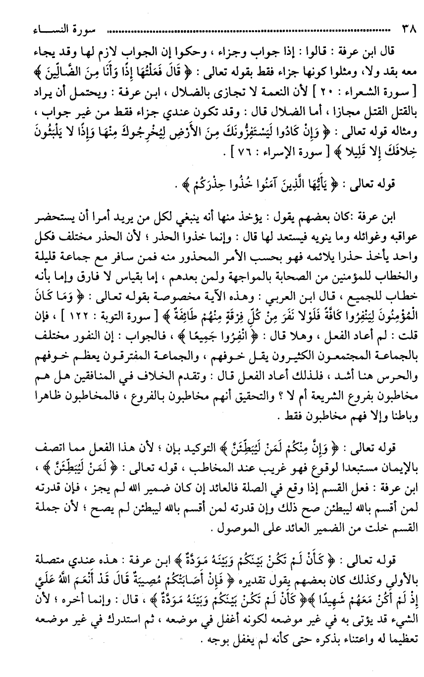 ابن عرفة: كان بعضهم يقول: يؤخذ منها أنه ينبغي لكل من يريد أمرا أن يستحضر عواقبه وغوائله وما ينويه فيستعد لها قال: وإنما خذوا الحذر؛ لأن الحذر مختلف فكل واحد يأخذ حذرا يلائمه فهو بحسب الأمر المحذور منه [فلا يسافر*] مع جماعة قليلة والخطاب للمؤمنين من الصحابة بالمواجهة ولمن بعدهم، إما بقياس لَا فارق وإما بأنه خطاب للجميع، قال ابن العربي: وهذه الآية مخصوصة بقوله تعالى: (وَمَا كَانَ الْمُؤْمِنُونَ لِيَنْفِرُوا كَافَّةً فَلَوْلَا نَفَرَ مِنْ كُلِّ فِرْقَةٍ مِنْهُمْ طَائِفَةٌ)، فإن قلت: لم أعاد الفعل، وهلا قال: (انفِرُوا جَمِيعًا)، فالجواب: إن النفور مختلف بالجماعة المجتمعون الكثيرون يقل خوفهم، والجماعة المفترقون يعظم خوفهم والحرس هنا أشد، فلذلك أعاد الفعل قال: وتقدم الخلاف في المنافقين هل هم مخاطبون بفروع الشريعة أم لَا؟ والتحقيق أنهم مخاطبون بالفروع، فالمخاطبون ظاهرا وباطنا وإلا فهم مخاطبون فقط.