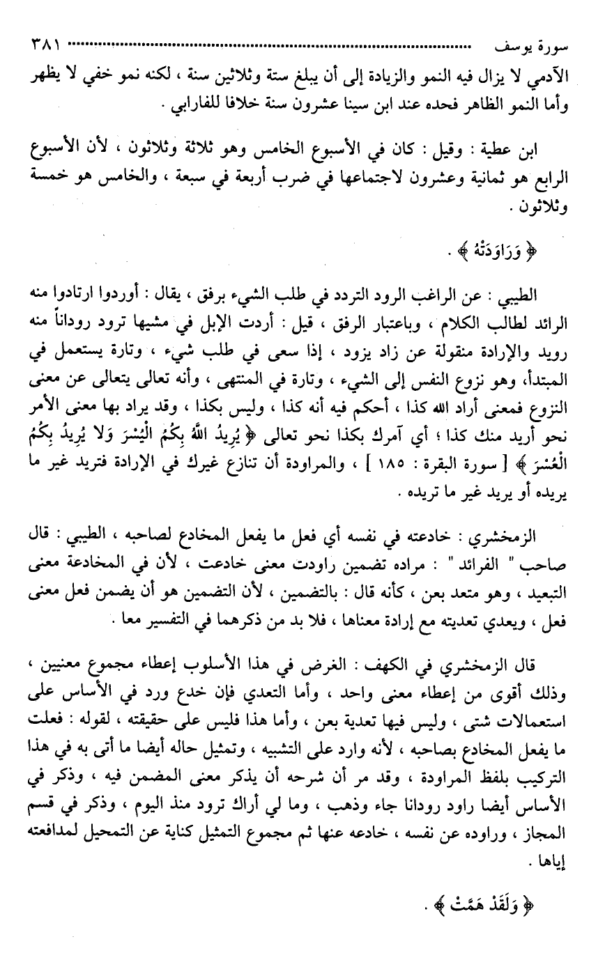 الزمخشري: خادعته في نفسه أي فعل ما يفعل المخادع لصاحبه، الطيبي: قال صاحب "الفرائد": مراده تضمين راودت معنى خادعت، لأن في المخادعة معنى التبعيد، وهو متعد بعن، كأنه قال: بالتضمين، لأن التضمين هو أن يضمن فعل معنى فعل، ويعدي تعديته مع إرادة معناها، فلا بد من ذكرهما في التفسير معا.