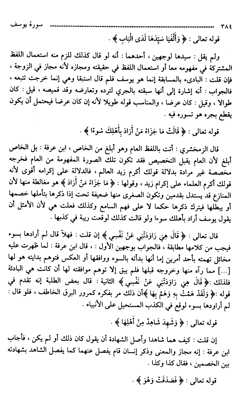 قال تعالى: (قَالَ هِيَ رَاوَدَتْنِي عَنْ نَفْسِي وَشَهِدَ شَاهِدٌ مِنْ أَهْلِهَا إِنْ كَانَ قَمِيصُهُ قُدَّ مِنْ قُبُلٍ فَصَدَقَتْ وَهُوَ مِنَ الْكَاذِبِينَ (26) .. إن قلت: فهلا قال [لم أردها بسوء، فيجد من كلامها مطابقة*]، فالجواب بوجهين الأول: قال ابن عرفة: لما ظهرت عليه مخائل تهمته بأحد أمرين إما أنها بدأته بالسوء ووافقها أو العكس فتوهم بدايته هو لها [ ... ] مما رآه منها وخروجه قبلها فلم يبق إلا توهم موافقته لها أن كانت هي البادئة فلذلك: (قَالَ هِيَ رَاوَدَتْنِي عَنْ نَفْسِي) الثانية: قال بعض الطلبة إنه تقدم في قوله: (وَلَقَدْ هَمَّتْ بِهِ وَهَمَّ بِهَا) أن ذلك مر بفكره كمرور البرق الخاطف، فلو قال: لم أراودها بسوء لوقع في الكذب المستحيل على الأنبياء.