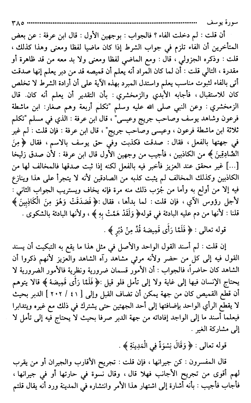 إن قلت: لم دخلت الفاء؟ فالجواب: بوجهين الأول: قال ابن عرفة: عن بعض المتأخرين أن الفاء تلزم في جواب الشرط إذا كان ماضيا لفظا ومعنى وهذا كذلك، قلت: وذكره الجزولي، قال: ومع الماضي لفظا ومعنى ولا بد معه من قد ظاهرة أو مقدرة، التالي قلت: أن لما كان المراد أنه يعلم أن قميصه قُدَّ من دبر يعلم إنها صدقت أتى بالفاء لثبوت مناسب يعلم واستدل المبرد بهذه الآية على أن إرادة الشرط لَا تخلص كان للاستقبال، فأجابه [الآبذي] والزمخشري: بأن التقدير أن يعلم أنه كان. قال الزمخشري: وعن النبي صلى الله عليه وسلم "تكلم أربعة وهم صغار: ابن ماشطة فرعون وشاهد يوسف وصاحب جريج وعيسى"، قال ابن عرفة: الذي في مسلم "تكلم ثلاثة ابن ماشطة فرعون، وعيسى وصاحب جريج"، قال ابن عرفة: فإِن قلت: لم [عبّر*] في جهتها بالفعل، فقال: صدقت فكذبت وفي حق يوسف بالاسم، فقال (مِنَ الصَّادِقِينَ) من الكاذبين، فأجيب من وجهين الأول قال ابن عرفة: لأن صدق زليخا [ ... ] غير محقق عند العزيز فأخبر فيه بالفعل لكنه إذا ثبت صدقها فالمخالف لها من الكاذبين وكذلك المخالف لم يثبت كذبه من الصادقين لأنه لَا يتجرأ على هذا وينازع فيه إلا من أولع به وأما من جُرّب ذلك منه مرة فإِنه يخاف ويستريب. الجواب الثاني: لأجل رؤوس الآي، فإن قلت: [لم بدأ بها*]، فقال: (فَصَدَقَتْ وَهُوَ مِنَ الْكَاذِبِينَ) قلنا: [**لأنها من دم عليه المبادئة] في قوله (وَلَقَدْ هَمَّتْ بِهِ)، ولأنها البادئة بالشكوى.