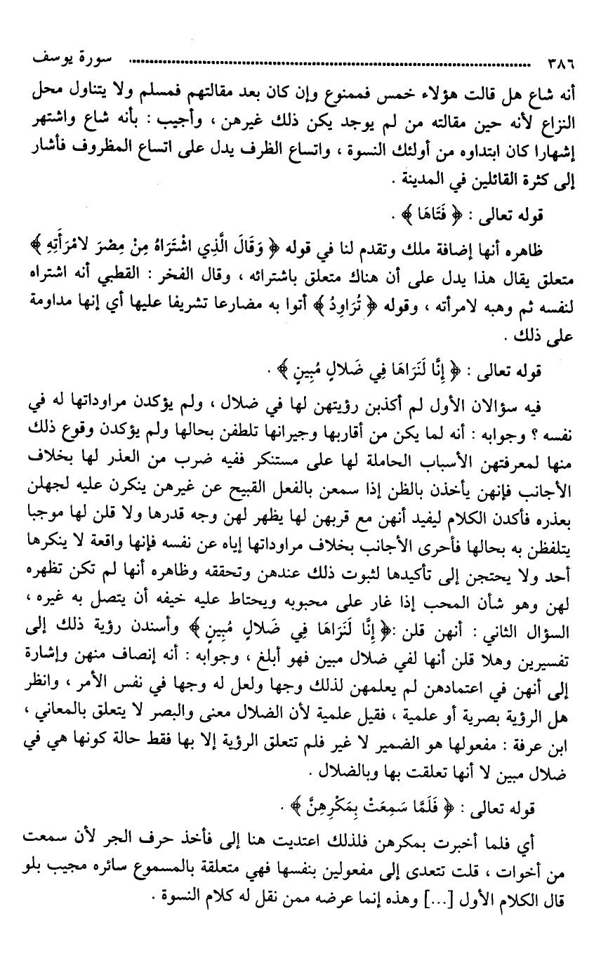 فيه سؤالان الأول لم أكذبن رؤيتهن لها في ضلال، ولم يؤكدن مراوداتها له في نفسه؟ وجوابه: أنه لما يكنَّ من أقاربها وجيرانها تلطفن بحالها ولم يؤكدن وقوع ذلك منها لمعرفتهن الأسباب الحاملة لها على مستنكر ففيه ضرب من العذر لها بخلاف الأجانب فإنهن يأخذن بالظن إذا سمعن بالفعل القبيح عن غيرهن ينكرن عليه لجهلن بعذره فأكدن الكلام ليفيد أنهن مع قربهن لها يظهر لهن وجه قدرها ولا قلن لها موجبا يتلفظن به بحالها فأحرى الأجانب بخلاف مراوداتها إياه عن نفسه فإِنها واقعة لَا ينكرها أحد ولا يحتجن إلى تأكيدها لثبوت ذلك عندهن وتحققه وظاهره أنها لم تكن تظهره لهن وهو شأن المحب إذا غار على محبوبه ويحتاط عليه خيفة أن يتصل به غيره، السؤال الثاني: أنهن قلن: (إِنَّا لَنَرَاهَا فِي ضَلَالٍ مُبِينٍ) وأسندن رؤية ذلك إلى تفسيرين وهلا قلن أنها لفي ضلال مبين فهو أبلغ، وجوابه: أنه إنصاف منهن وإشارة إلى أنهن في اعتمادهن لم يعلمهن لذلك وجها ولعل له وجها في نفس الأمر، وانظر هل الرؤية بصرية أو علمية، فقيل علمية لأن الضلال معنى والبصر لَا يتعلق بالمعاني، ابن عرفة: مفعولها هو الضمير لَا غير فلم تتعلق الرؤية إلا بها فقط حالة كونها هي في ضلال مبين لَا أنها تعلقت بها وبالضلال.