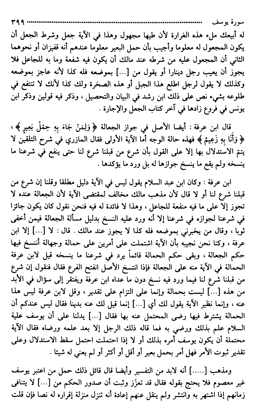 ابن عرفة: وكان ابن عبد السلام يقول ليس في الآية دليل مطلقا وقلنا إن شرع من قبلنا شرع لنا أو لَا قال لأن مذهب مالك مخالف لمقتضى الآية لأن الجعالة عنده لا تجوز إلا على ما فيه منفعة للجاعل، وهذا لَا فائدة له فيه فنحن نقول كان يكون جائزا في شرعنا لجوازه في شرعنا إلا أنه ورد عليه النسخ بدليل مسألة الجعالة فيمن أخفى ثوبا، وقال من يخبرني بموضعه فله كذا لَا يجوز عند مالك. قال: لَا [ ... ] إلا ابن عرفة، وكنا نحن نجيبه بأن الآية اشتملت على أمرين على حمالة وجهالة أننسخ فيها حكم الجعالة، وبقي حكم الحمالة قائماً يرد في شرعنا ما ينسخه. قيل لابن عرفة: الحمالة في الآية منه على الجعالة فإِذا انتسخ الأصل [انتسخ*] الفرع فقال فنقول إن شرع من قبلنا شرع لنا فيما ورد فيه نسخ دون ما عداه. ابن عرفة ويفتقر إلى سؤال في الأبد من هذه [ ... ] ليست بحمالة وإنما على التزام على تقدير، وقيل لابن عرفة: ليس هذا عنه، وإنما نظير الآية يقول لك أي [ ... ] إنما قيل لك عنه [**بدينا] فقال ليس عندكم أن الحمالة يشترط فيها رضى المحتمل عنه بها فقال [ ... ] يدلنا على أن يوسف عليه السلام علم بذلك ورضي به فما قاله ذلك الرجل إلا بعد علمه ورضاه فقال الآية محتملة أن يكون يوسف أمره بذلك أو لَا إذا احتملت احتمل سقط الاستدلال وعلى تقدير ثبوت الأمر فهل أمر بحمل بعير أو أقل أو أكثر أو لم يعني له شيئا.