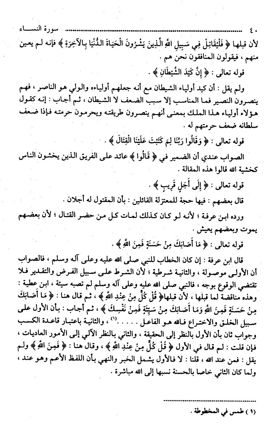 قال ابن عرفة: إن كان الخطاب للنبي صلى الله عليه وعلى آله وسلم، فالصواب أن الأولى موصولة، والثانية شرطية؛ لأن الشرط على سبيل الفرض والتقدير فلا تقتضي الوقوع بوجه، فالنبي صلى الله عليه وعلى آله وسلم لم تصبه سيئة، ابن عطية: وهذه مناقضة لما قبلها، لأن قبلها (قُلْ كُلٌّ مِنْ عِنْدِ اللَّهِ)، ثم قال هنا: (مَا أَصَابَكَ مِنْ حَسَنَةٍ فَمِنَ اللَّهِ وَمَا أَصَابَكَ مِنْ سَيِّئَةٍ فَمِنْ نَفْسِكَ)، ثم أجاب: بأن الأول على سبيل الخلق والاختراع فالله هو الفاعل [ ... ]، والثانية باعتبار قاعدة الكسب وجواب ثان بأن الأول بالنظر إلى الحقيقة، والثاني بالنظر الألي إلى الأمور العاديات، فإن قلت: لم قال في الأول (قُلْ كُلٌّ مِنْ عِنْدِ اللَّهِ)، وقال هنا: (فَمِنَ اللَّهِ) ولم يقل: فمن عند الله، قلنا: لَا فالأول يشمل الخبر والنهي بأن اللفظ الأعم وهو عند، ولما كان الثاني خاصا بالحسنة نسبها إلى الله مباشرة.