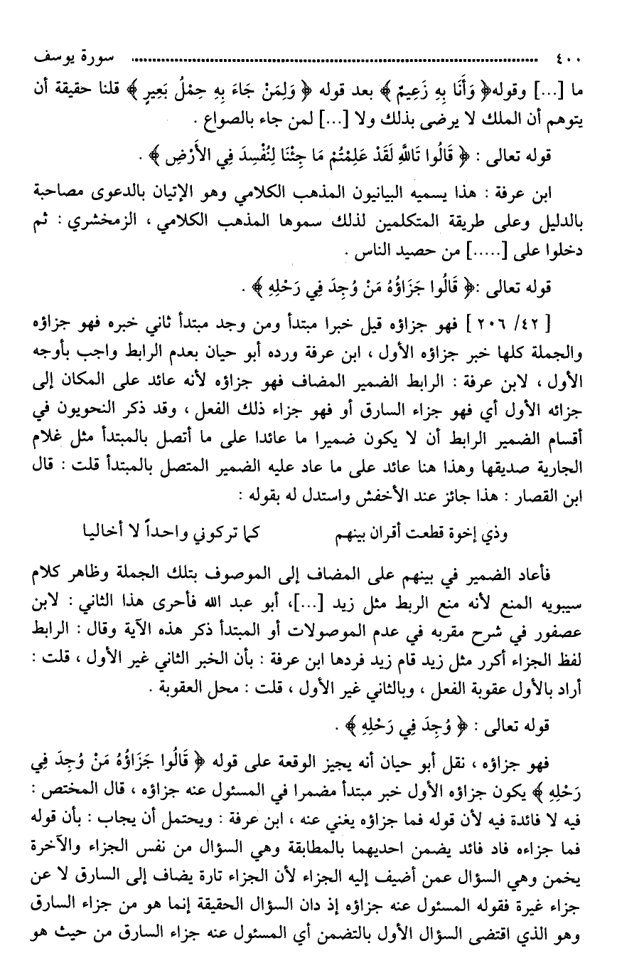نقل أبو حيان أنه يجيز [الوقف*] على قوله (قَالُوا جَزَاؤُهُ مَنْ وُجِدَ فِي رَحْلِهِ) يكون (جَزَاؤُهُ) الأول خبر مبتدأ مضمرا في المسئول عنه جزاؤه، قال المختص: فيه لَا فائدة فيه لأن قوله (فما جزاؤه) يغني عنه، ابن عرفة: ويحتمل أن يجاب: بأن قوله [(فما جَزَاؤُهُ) أفاد فائدة*] يضمن إحديهما بالمطابقة وهي السؤال [عن*] نفس الجزاء، والآخرة [يضمن*] وهي السؤال عمن أضيف إليه الجزاء؛ لأن الجزاء تارة يضاف إلى السارق لَا عن جزاء غيره؛ فقوله المسئول عنه جزاؤه إذ وإن السؤال الحقيقة إنما هو من جزاء السارق وهو الذي اقتضى السؤال الأول بالتضمن أي المسئول عنه جزاء السارق من حيث هو