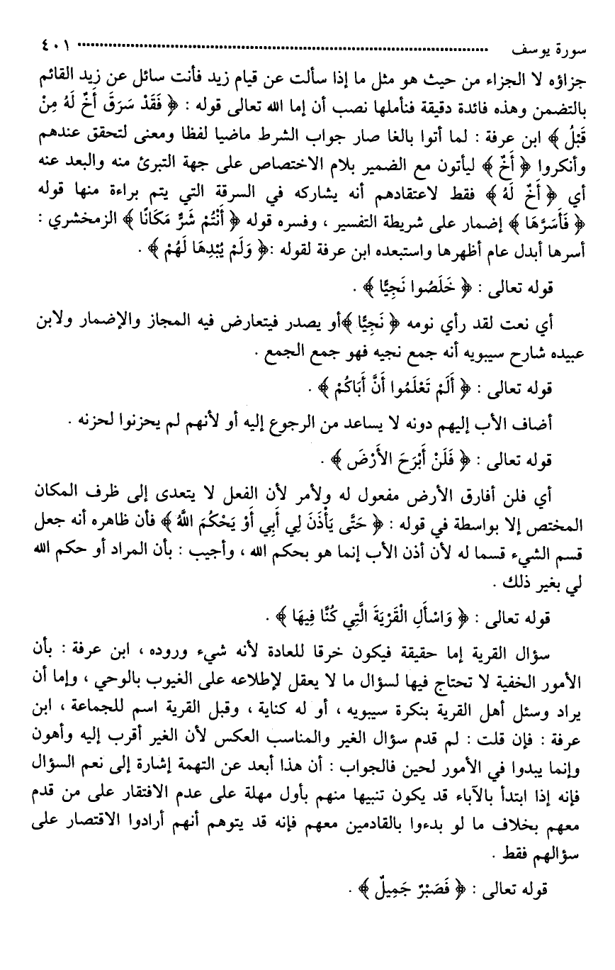 جزاؤه لَا الجزاء من حيث هو مثل ما إذا سألت عن قيام زيد فأنت سائل عن زيد القائم بالتضمن وهذه فائدة دقيقة [فتأملها*] [**نصب أن إما الله تعالى] قوله: (فَقَدْ سَرَقَ أَخٌ لَهُ مِنْ قَبْلُ ... (77) .. ابن عرفة: [لما أتوا بالمضارع*] صار جواب الشرط ماضيا لفظا ومعنى لتحقق [علمهم*] [ونكروا (أَخٌ) ليأتوا*] مع الضمير بلام الاختصاص على جهة التبرئ منه والبعد عنه أي (أَخٌ لَهُ) فقط لاعتقادهم أنه يشاركه في السرقة [التي لم تم براءته منها*] قوله (فَأَسَرَّهَا) إضمار على شريطة التفسير، وفسره قوله (أَنْتُمْ شَرٌّ مَكَانًا) الزمخشري: [أَنْتُمْ شَرٌّ مَكاناً بدل من (أسرَّها) *] واستبعده ابن عرفة لقوله: (وَلَم يُبْدِهَا لَهُمْ).
