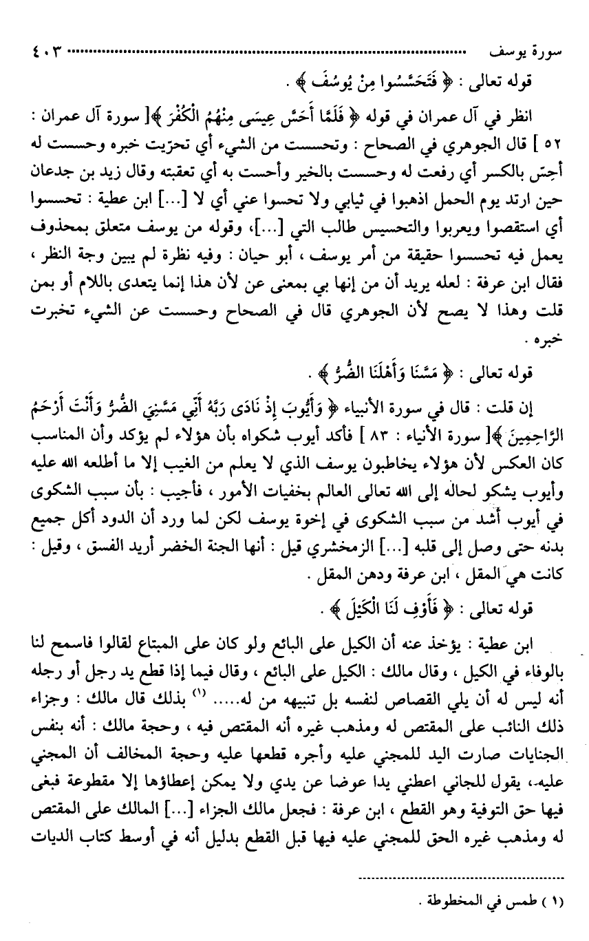 انظر في آل عمران في قوله (فَلَمَّا أَحَسَّ عِيسَى مِنْهُمُ الْكُفْرَ) قال الجوهري في الصحاح: وتحسست من الشيء أي [تخبرت خبره*] وحسست له أحِسّ بالكسر أي رفعت له وحسست بالخير وأحست به أي تعقبته وقال زَيْد بْنُ [صُوحانَ*] حين [ارْتُثَّ*] يوم الجمل [ادْفِنوني*] في ثيابي ولا تحسوا عني [تُراباً، أي لا تَنْفُضوه]، ابن عطية: [فَتَحَسَّسُوا*] أي استقصوا [ونقروا*] [والتحسس الشيء بالحواس من البصر والسمع*]، وقوله (من يوسف) متعلق بمحذوف يعمل فيه (تحسسوا) حقيقة من أمر يوسف، أبو حيان: وفيه [نظر*] لم يبين [وجهة*] النظر، فقال ابن عرفة: لعله يريد [أن مِن هنا بمعنى عن*] لأن هذا إنما يتعدى باللام أو بمن قلت وهذا لَا يصح لأن الجوهري قال في الصحاح وحسست عن الشيء تخبرت خبره.
