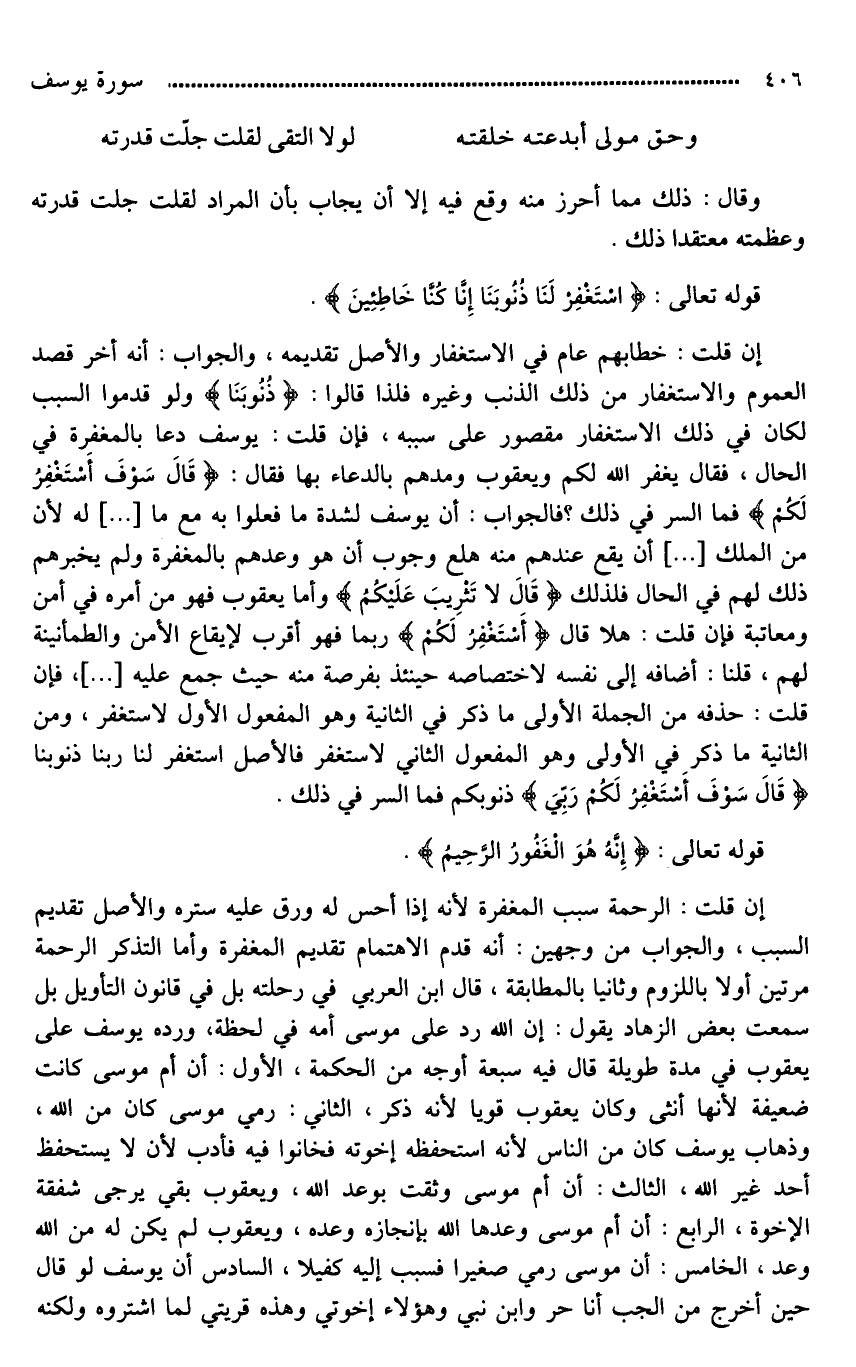 إن قلت: خطابهم عام في الاستغفار والأصل تقديمه، والجواب: أنه أخر قصد العموم والاستغفار من ذلك الذنب وغيره فلذا قالوا: (ذُنُوبَنَا) ولو قدموا السبب لكان في ذلك الاستغفار [مقصور*] على سببه، فإِن قلت: يوسف دعا بالمغفرة في الحال، فقال (يغفر الله لكم) ويعقوب [وعدهم*] بالدعاء بها فقال: (قَالَ سَوْفَ أَسْتَغْفِرُ لَكُمْ رَبِّي إِنَّهُ هُوَ الْغَفُورُ الرَّحِيمُ (98) .. فما السر في ذلك؟ فالجواب: أن يوسف لشدة ما فعلوا به مع ما [ ... ] له لأن من الملك [ ... ] أن يقع عندهم منه هلع [**وجوب أن هو وعدهم بالمغفرة ولم يخبرهم ذلك لهم في الحال] فلذلك (قَالَ لَا تَثرِيبَ عَلَيْكُمُ) وأما يعقوب فهو من أمره في أمن ومعاتبة. فإِن قلت: هلا قال (أَسْتَغْفِرُ لَكُمْ) ربما فهو أقرب لإيقاع الأمن والطمأنينة لهم، قلنا: أضافه إلى نفسه لاختصاصه حينئذ بفرصة منه حيث جمع عليه [ ... ]، فإن قلت: حذفه من الجملة الأولى ما ذكر في الثانية وهو المفعول الأول لاستغفر، ومن الثانية ما ذكرِ في الأولى وهو المفعول الثاني لاستغفر فالأصل استغفر لنا ربنا ذنوبنا (قَالَ سَوْفَ أَسْتَغْفِرُ لَكُمْ رَبِّي) [ذنوبكم*] فما السر في ذلك.