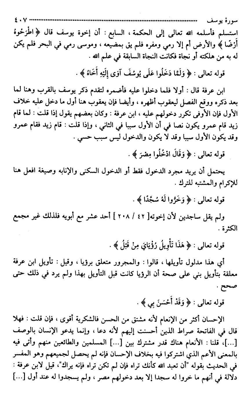 الإحسان أكثر من الإنعام لأنه مشتق من الحسن فالشكرية أقوى، فإِن قلت: فهلا قال في الفاتحة صراط الذين أحسنت إليهم لأنه دعاء، وإنما يدعو الإنسان بالوصف [ ... ]، قلنا: الإنعام هناك قدر مشترك بين [ ... ] المسلمين والطائعين منهم وأتى فيه بالمعنى الأعم الذي اشتركوا فيه بخلاف الإحسان فإِنه لم يحصل لجميعهم وهو المفسر في الحديث بقوله "أن تعبد الله كأنك تراه فإِن لم تكن تراه فإِنه يراك"، قيل لابن عرفة: دلالة في أنهم ما خروا له سجدا إلا بعد دخولهم مصر، ولم يسجدوا له عند أول [ ... ]