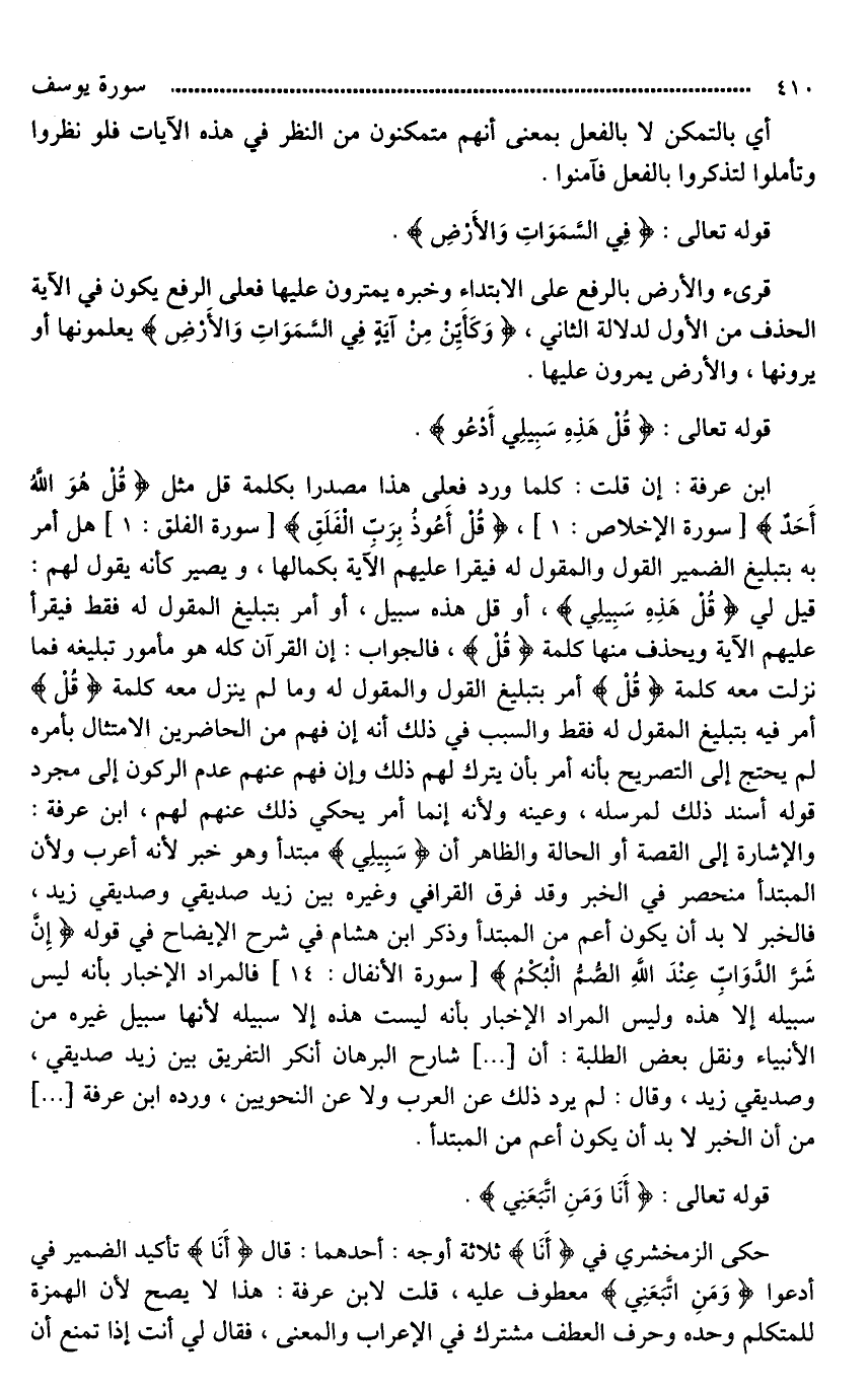 حكى الزمخشري في (أَنَا) ثلاثة أوجه: أحدهما: قال (أَنَا) تأكيد الضمير في أدعوا (وَمَنِ اتَّبَعَنِي) معطوف عليه، قلت لابن عرفة: هذا لَا يصح لأن الهمزة للمتكلم وحده وحرف العطف مشترك في الإعراب والمعنى، فقال لي أنت إذًا تمنع أن
