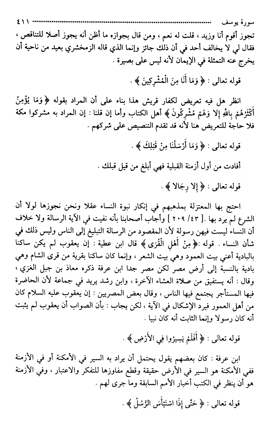 احتج بها المعتزلة بمذهبهم في إنكار نبوة النساء عقلا ونحن نجوزها لولا أن الشرع لم يرد بها، وأجاب أصحابنا بأنه نفيت في الآية الرسالة ولا خلاف أن النساء ليست فيهن رسولة؛ لأن المقصود من الرسالة التبليغ إلى النَّاس وليس ذلك في شأن النساء. قوله: (مِنْ أَهْلِ الْقُرَى) قال ابن عطية: إن يعقوب لم يكن ساكنا بالبادية أعني بيت العمود وهي بيت الشعر، وإنما كان ساكنا بقرية من قرى الشام وهي بادية بالنسبة إلى أرض مصر [كما هي بنات الحواضر بدو بالإضافة إلى الحواضر*]. ابن عرفة ذكره معاذ بن جبل الغزي، وقال: أنه يستفيق من صلاة العشاء الآخرة، وابن رشد يريد في جماعة لأن الحاضرة فيها المستأجر يجتمع فيها النَّاس، وقال بعض المصريين: إن يعقوب عليه السلام كان من أهل العمور فيرد الإشكال في الآية، لكن يجاب: بأن الصواب أن يعقوب لم يثبت أنه كان رسولا وإنَّمَا الثابت أنه كان نبيا.