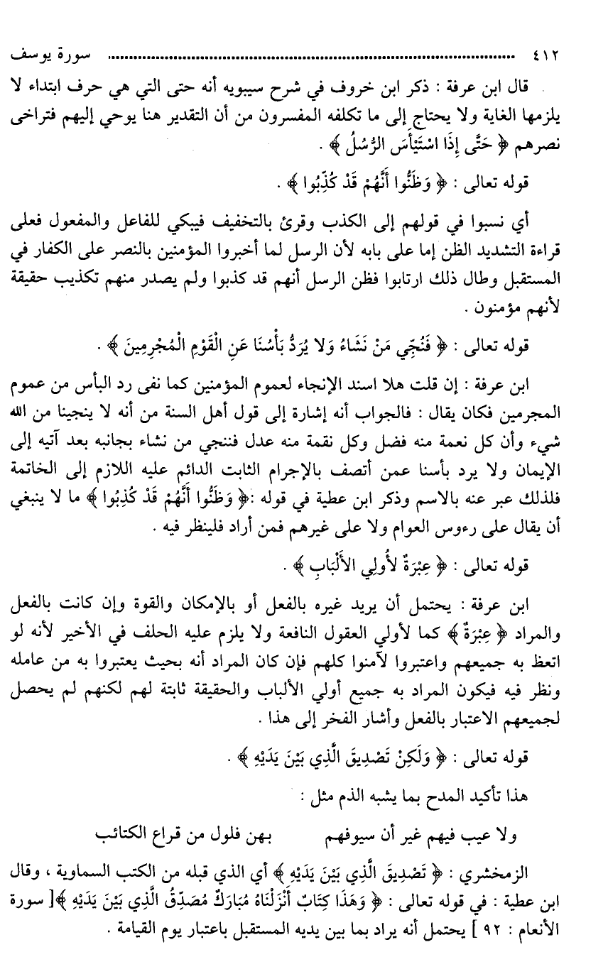 قال ابن عرفة: ذكر ابن خروف في شرح سيبويه أنه حتى التي هي حرف ابتداء لا يلزمها الغاية ولا يحتاج إلى ما تكلفه المفسرون من أن التقدير هنا يوحي إليهم فتراخى نصرهم (حَتَّى إِذَا اسْتَيْأَسَ الرُّسُلُ).