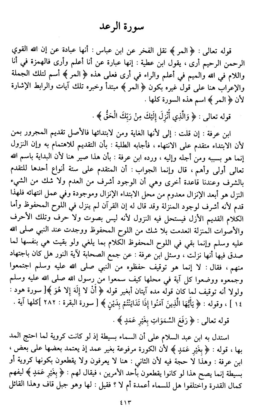 استدل به ابن عبد السلام على أن السماء بسيطة؛ إذ لو كانت [كورية*] لما [**احتج المد بها]، قوله: (بِغَيْرِ عَمَدٍ) لأن الكورة مرفوعة بغير عمد إذ يعتمد بعضها على بعض، ابن عرفة: وهذا لَا حجة فيه لأن الثاني: هنا لَا يعرفون ولا يقطعون بكونها [كورية*] أو بسيطة، إنما يصح هذا لو كانوا يقطعون بأحد الأمرين، فيقال لهم: (بِغَيْرِ عَمَدٍ) ليفهم كمال القدرة، واختلفوا هل للسماء أعمدة أم لَا؟ فقيل: لها وهو جبل قاف وهذا القائل