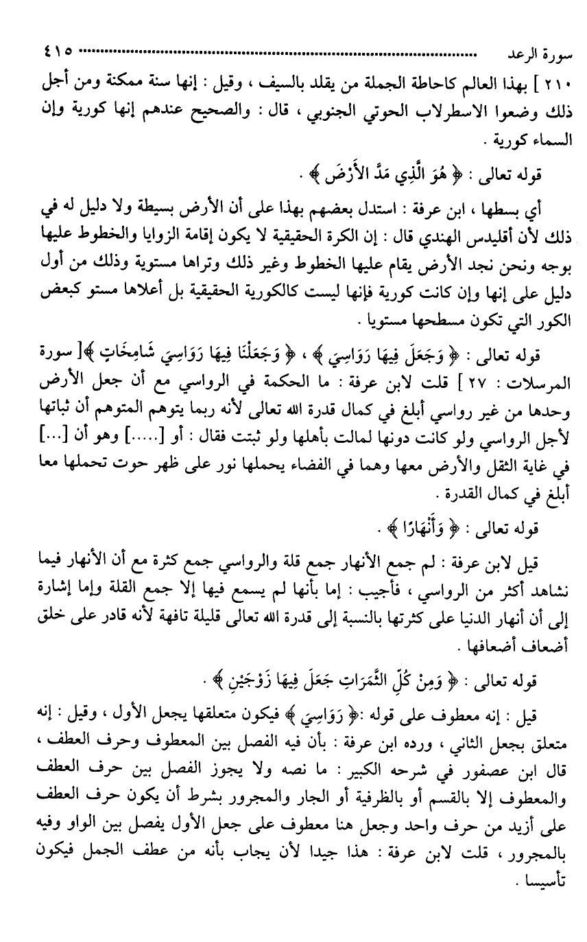 قوله تعالى: (وَجَعَلَ فِيهَا رَوَاسِيَ)، (وَجَعَلْنَا فِيهَا رَوَاسِيَ شَامِخَاتٍ) قلت لابن عرفة: ما الحكمة في الرواسي مع أن جعل الأرض وحدها من غير رواسي أبلغ في كمال قدرة الله تعالى لأنه ربما يتوهم المتوهم أن ثباتها لأجل الرواسي ولو كانت دونها لمالت بأهلها ولو ثبتت؟ فقال: أو [ ... ] وهو أن [ ... ] في غاية الثقل والأرض معها وهما في الفضاء يحملها نور على ظهر حوت تحملها معا أبلغ في كمال القدرة.