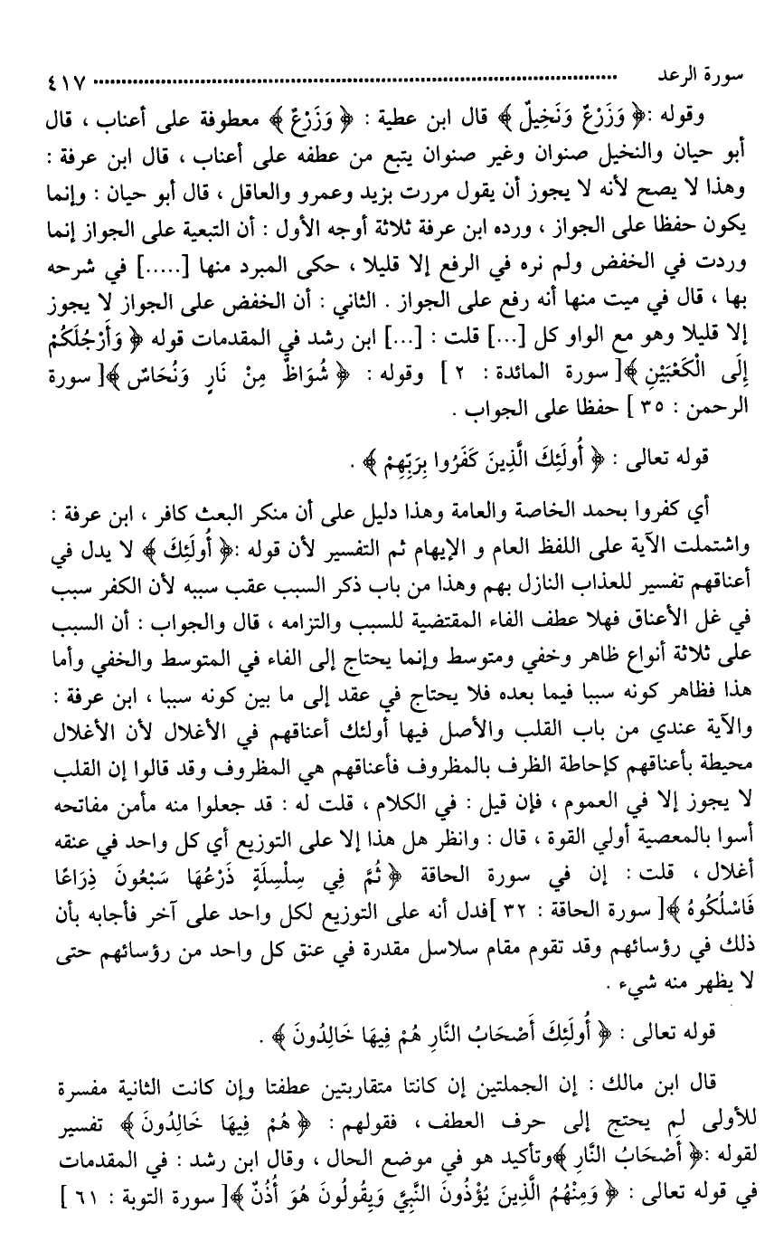 وقوله: (وَزَرْعٌ وَنَخِيلٌ) قال ابن عطية: (وَزَرْعٌ) معطوفة على أعناب، قال أبو حيان والنخيل (صنوان وغير صنوان) يتبع من عطفه على (أَعْنَابٍ)، قال ابن عرفة: وهذا لَا يصح لأنه لَا يجوز أن يقول مررت بزيد وعمرو والعاقل، قال أبو حيان: وإنما يكون [حملا على الجوار*]، ورده ابن عرفة ثلاثة أوجه الأول: أن التبعية على [الجوار*] إنما وردت في الخفض ولم نره في الرفع إلا قليلا، حكى المبرد منها [ ... ] في شرحه بها، قال في [**ميت منها] أنه رفع [على الجوار]. الثاني: أن الخفض على [الجوار*] لَا يجوز إلا قليلا وهو مع الواو كل [ ... ] قلت: [ ... ] ابن رشد في المقدمات قوله (وَأَرْجُلَكُم إِلَى الْكَعْبَيْنِ) وقوله: (شُوَاظٌ مِنْ نَارٍ وَنُحَاسٌ) [عطفا على الجوار*].