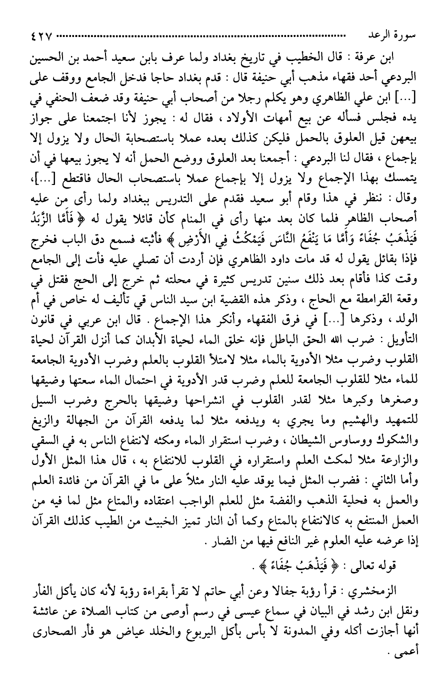 ابن عرفة: قال الخطيب في تاريخ بغداد ولما عرف بابن سعيد أحمد بن الحسين [الْبَرْذَعِيّ*] أحد فقهاء مذهب أبي حنيفة قال: قدم بغداد حاجا فدخل الجامع ووقف على [دَاوُد بْن عَلِيّ*] الظاهري وهو يكلم رجلا من أصحاب أبي حنيفة وقد ضعف الحنفي في يده فجلس فسأله عن بيع أمهات الأولاد، فقال له: يجوز لأنا [أجمعنا*] على جواز بيعهن [قَبْلَ*] العلوق [ووضع الحمل*] فليكن كذلك بعده عملا [باستصحاب*] الحال، ولا يزول إلا بإجماع، فقال لنا [الْبَرْذَعِيُّ*]: أجمعنا بعد العلوق [قبل وضع*] الحمل أنه لَا يجوز بيعها [فيجب أن نتمسك*] بهذا الإجماع [ولا نزول عَنْهُ إلا بإجماع مثله فأنقطع دَاوُد] *، وقال: ننظر في هذا، وقام أبو سعيد [فعزم*] على التدريس ببغداد، ولما رأى من [غلبة*] أصحاب الظاهر فلما كان بعد [مديدة*] رأى في المنام كأن قائلا يقول له (فَأَمَّا الزَّبَدُ فَيَذْهَبُ جُفَاءً وَأَمَّا مَا يَنْفَعُ النَّاسَ فَيَمْكُثُ فِي الْأَرْضِ) [فانتبه*] فسمع دق الباب فخرج [فإذ*] بقائل يقول له: قد مات داود الظاهري فإن أردت أن تصلي عليه فأت إلى الجامع وقت كذا، فأقام بعد ذلك سنين [كثيرة يدرس*] في محلته، ثم خرج إلى الحج فقتل في وقعة القرامطة مع الحاج، وذكر هذه القضية ابن سيد النَّاس في تأليف له خاص في أم الولد، وذكرها [ ... ] في فرق الفقهاء وأنكر هذا الإجماع. قال ابن عربي في قانون التأويل: ضرب الله الحق الباطل، فإنه خلق الماء لحياة الأبدان؛ كما أنزل القرآن لحياة القلوب، وضرب مثلا [الأودية*] بالماء مثلا [لامتلاء*] القلوب بالعلم، وضرب [الأودية*] الجامعة للماء مثلا للقلوب الجامعة للعلم، وضرب قدر [الأودية*] في احتمال الماء سعتها وضيقها وصغرها وكبرها مثلا لقدر القلوب في انشراحها وضيقها بالحرج، وضرب السيل للتمهيد والهشيم وما يجري به ويدفعه مثلا لما يدفعه القرآن من الجهالة والزيغ والشكوك ووساوس الشيطان، وضرب استقرار الماء ومكثه لانتفاع النَّاس به في السقي والزارعة مثلا لمكث العلم واستقراره في القلوب للانتفاع به، قال هذا المثل الأول وأما الثاني: فضرب المثل فيما يوقد عليه النار مثلا على ما في القرآن من فائدة العلم والعمل به فحلية الذهب والفضة مثل للعلم الواجب اعتقاده والمتاع مثل لما فيه من العمل المنتفع به كالانتفاع بالمتاع وكما أن النار تميز الخبيث من الطيب كذلك القرآن إذا عرضه عليه العلوم غير النافع فيها من الضار.