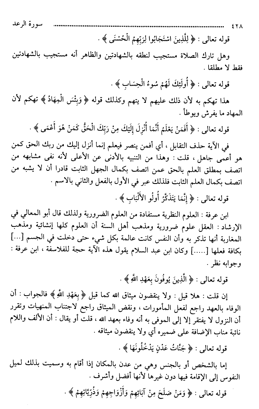 ابن عرفة: العلوم النظرية مستفادة من العلوم الضرورية؛ ولذلك قال أبو المعالي في الإرشاد: العقل علوم ضرورية، ومذهب أهل السنة أن العلوم كلها إنشائية، ومذهب المغاربة أنها تذكر به وأن النفس كانت عالمة بكل شيء حتى دخلت في الجسم [ ... ] بكافة فعلها [ ... ] وكان ابن عبد السلام يقول هذه الآية حجة للفلاسفة، ابن عرفة: وجوابه نظر.